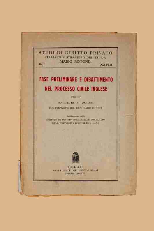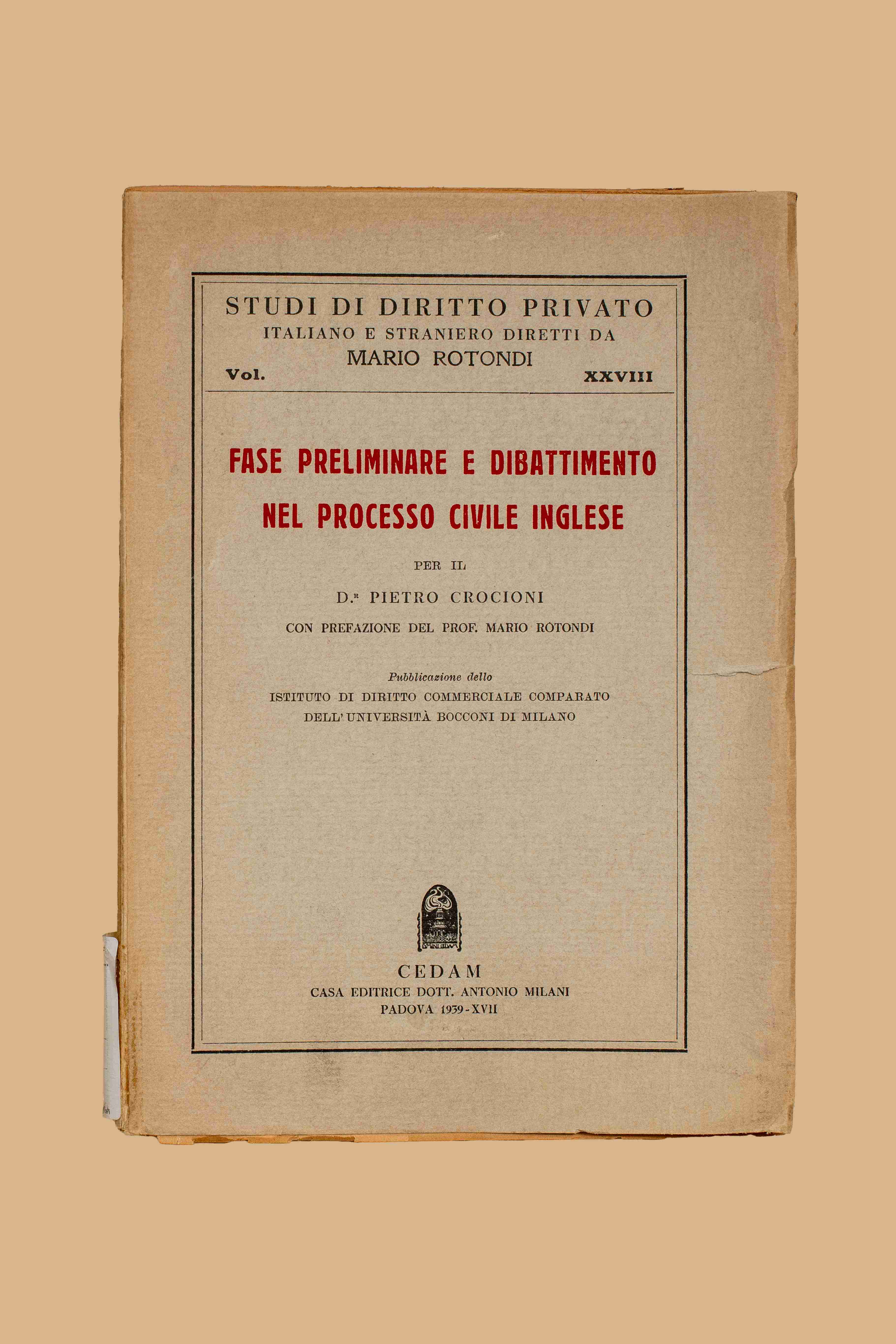 Titolo: Fase preliminare e dibattimento nel processo civile inglese / Pietro Crocioni ; con prefazione [di] Mario Rotondi. - Padova : CEDAM, 1939. - XXVIII, 206 p. ; 25 cm. - (Studi di diritto privato italiano e straniero ; 28) . - Sul front.: Pubblicazione dello Istituto di diritto comparato dell'Universita Bocconi di Milano.