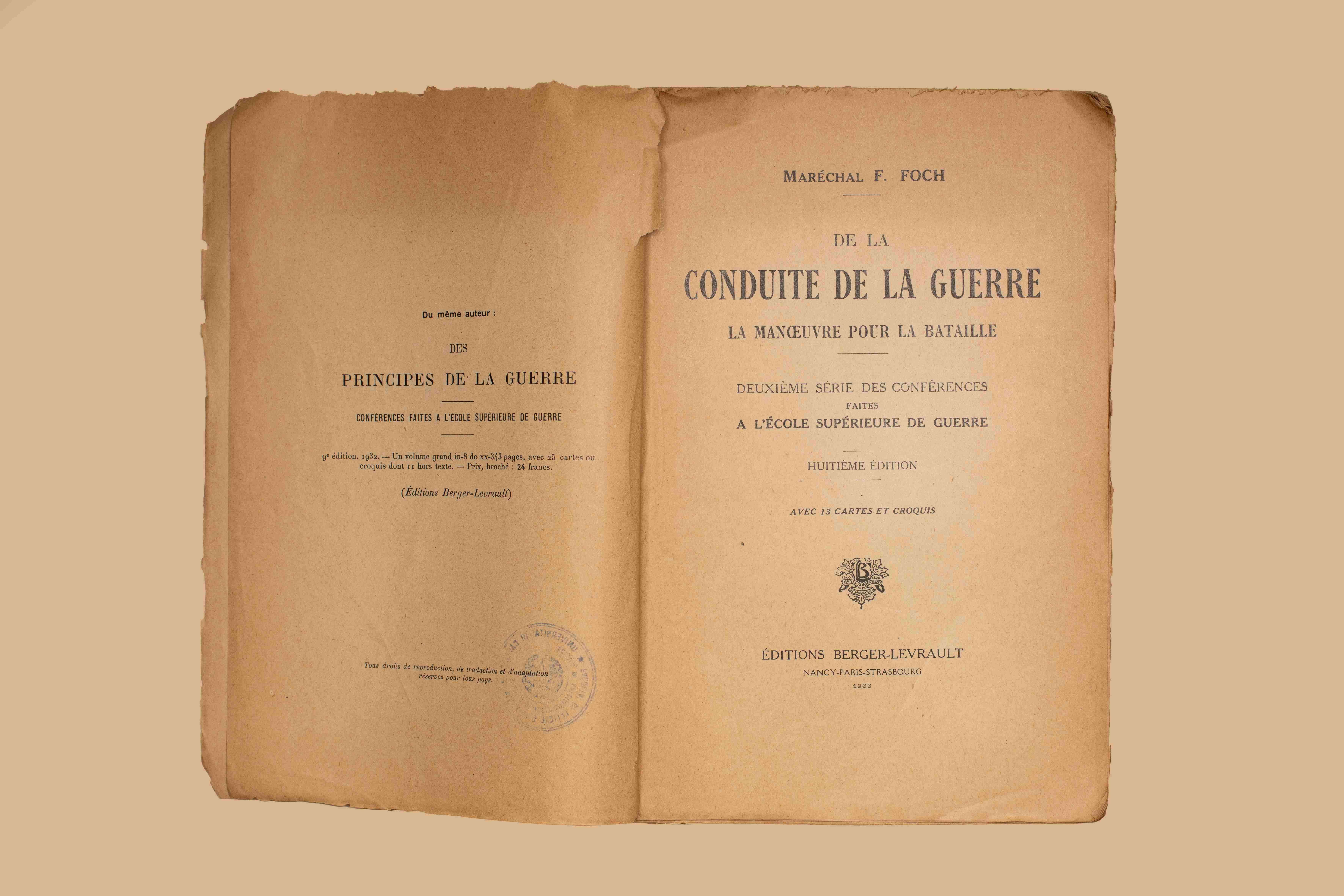 - De la conduite de la guerre : la manoeuvre pour la bataille : deuxième série des conférences faites à l’École supérieure de guerre / F. Foch. - 8. ed. - Nancy [etc.] : Berger-Levrault, 1933. - XVII, 494 p. ; 25 cm.