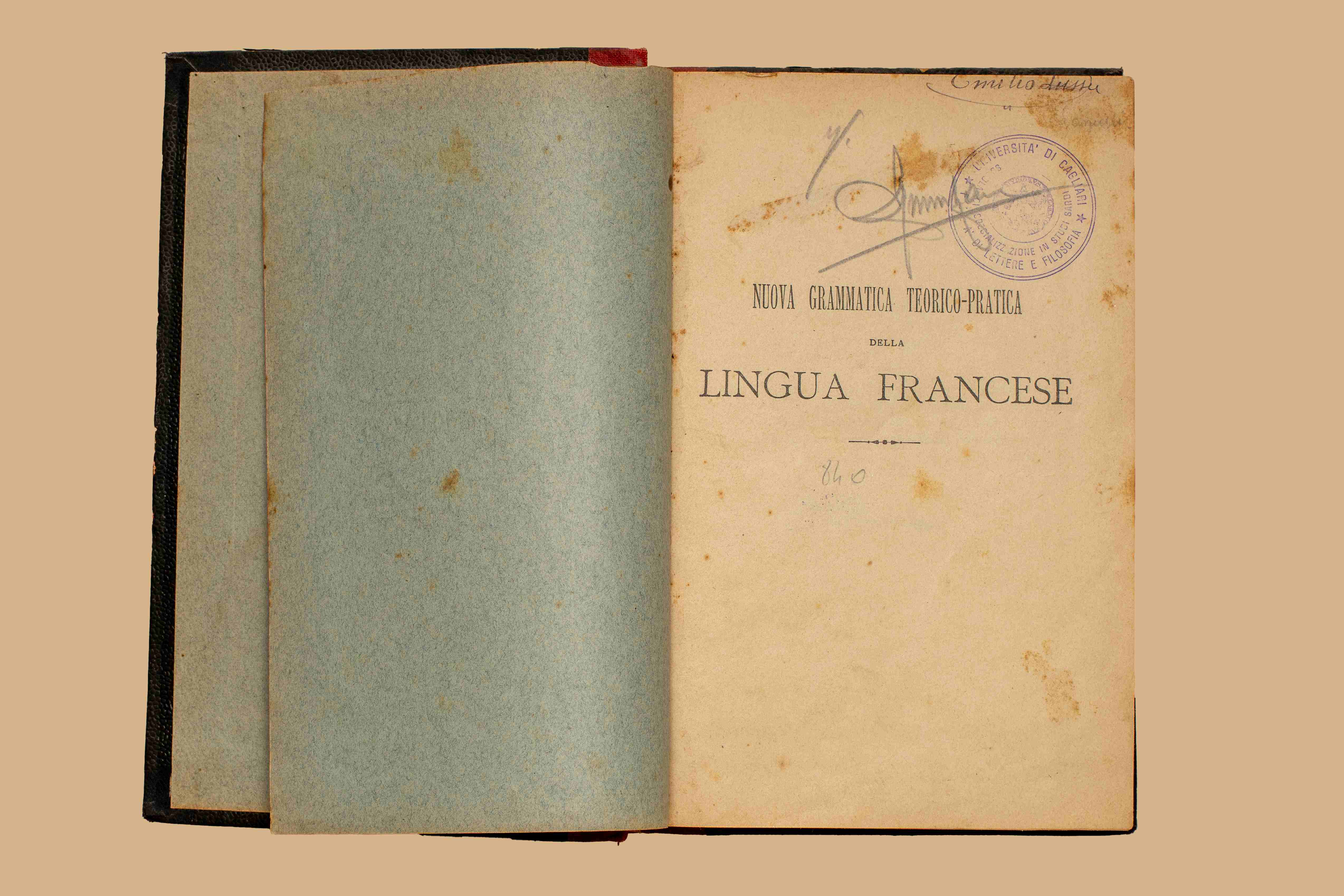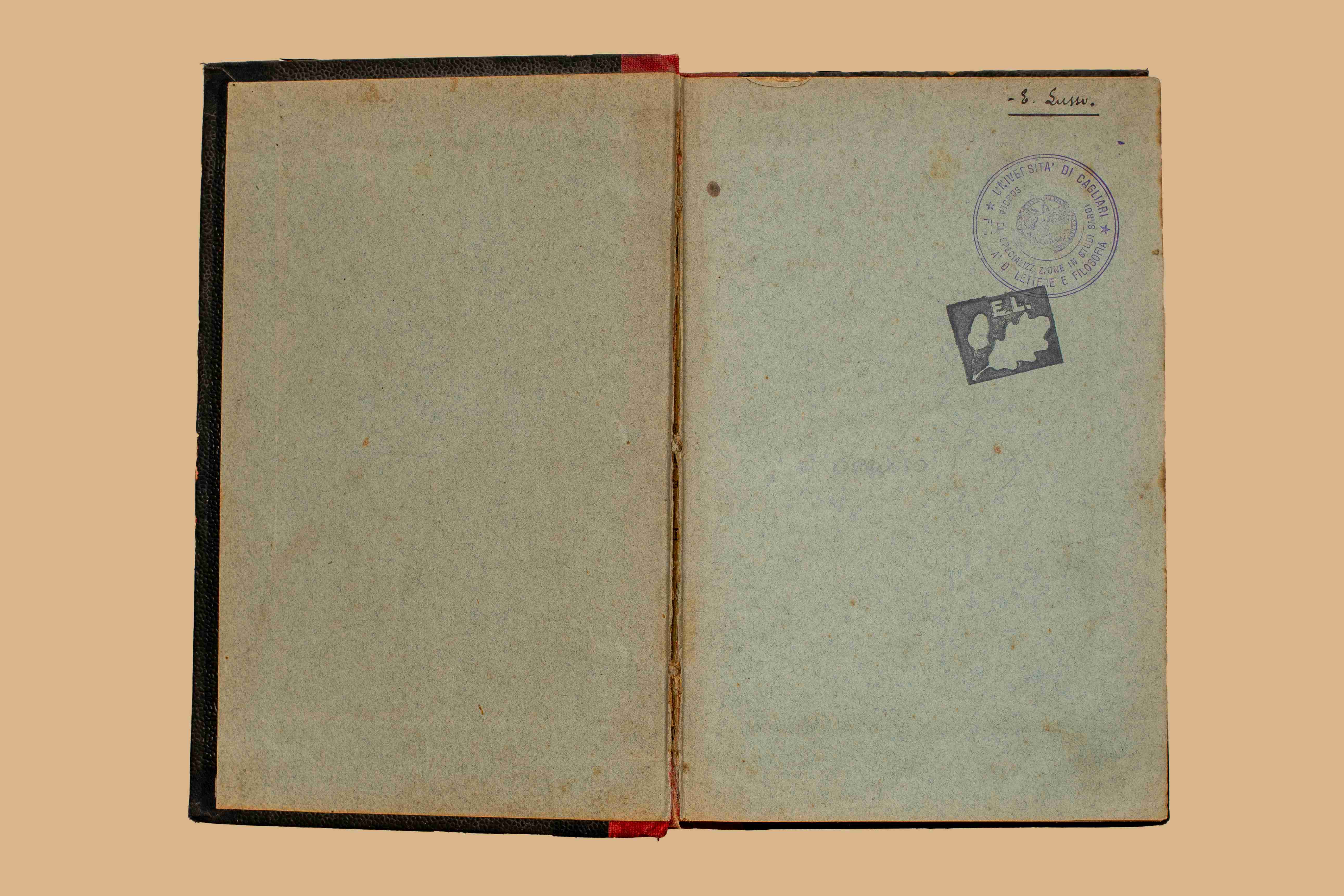 - Nel risguardo ms. “E. Lussu”. Nell’occhietto. ms. “Emilio Lussu” seguito da “Lanusei”; visto del carcere di Buoncammino di Cagliari. Diverse sottolineature.