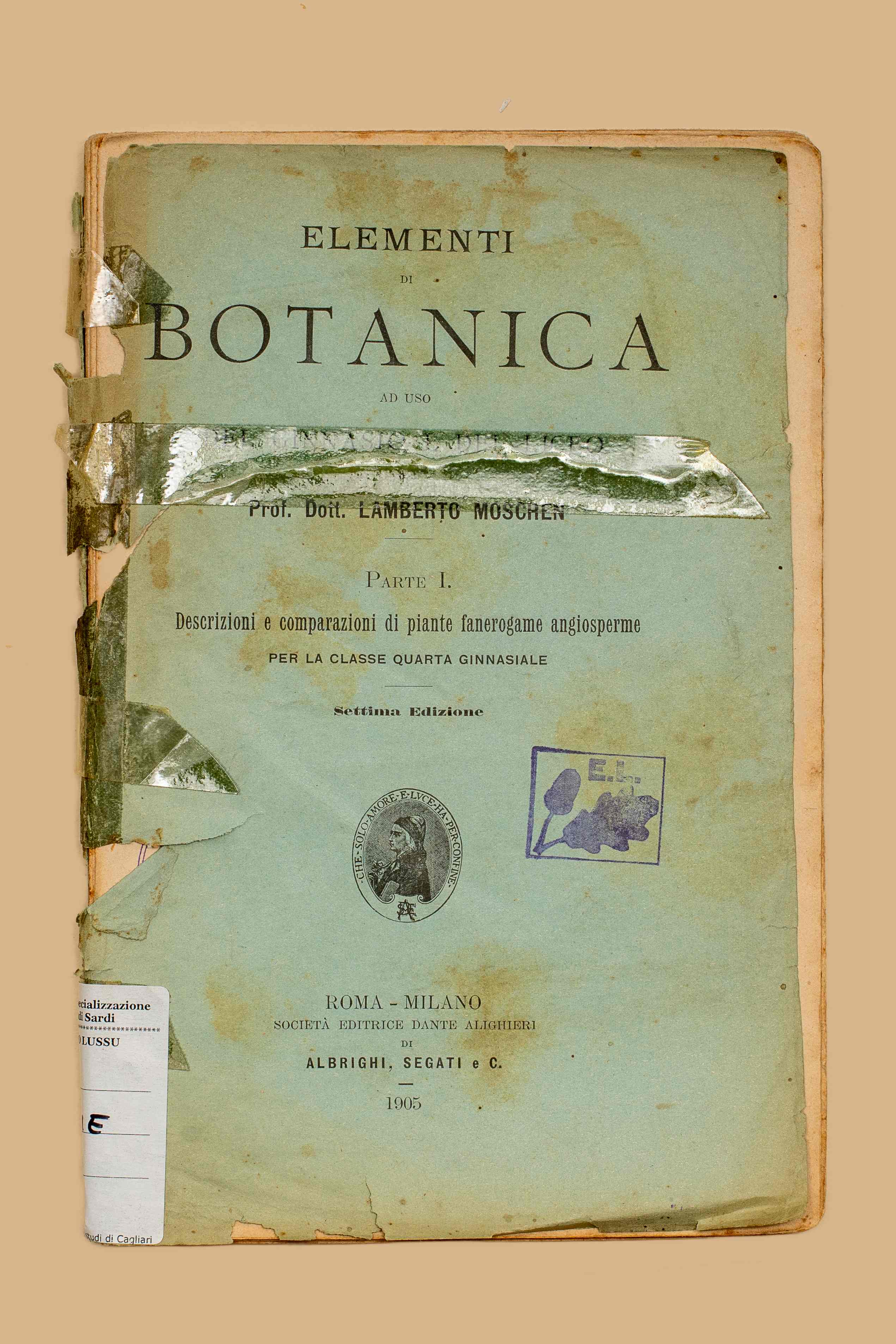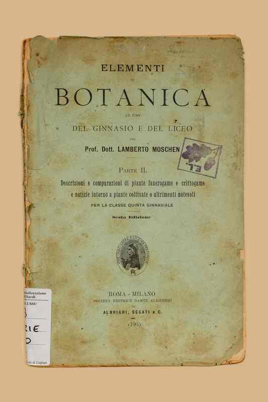 Titolo: Elementi di botanica ad uso del ginnasio e del liceo / L. Moschen. - Roma ; Milano : Dante Alighieri. - 4 v. ; 21 cm. 1: Descrizioni e comparazioni di piante fanerogame angiosperme : per la classe 4. ginnasiale / Lamberto Moschen. - 7. ed. - 1905. - 210 p. : ill. 2: Descrizioni e comparazioni di piante fanerogame e crittogame e notizie intorno a piante coltivate o altrimenti notevoli : per la classe 5. ginnasiale. - 6. ed. - 1905. - 176 p. : ill.