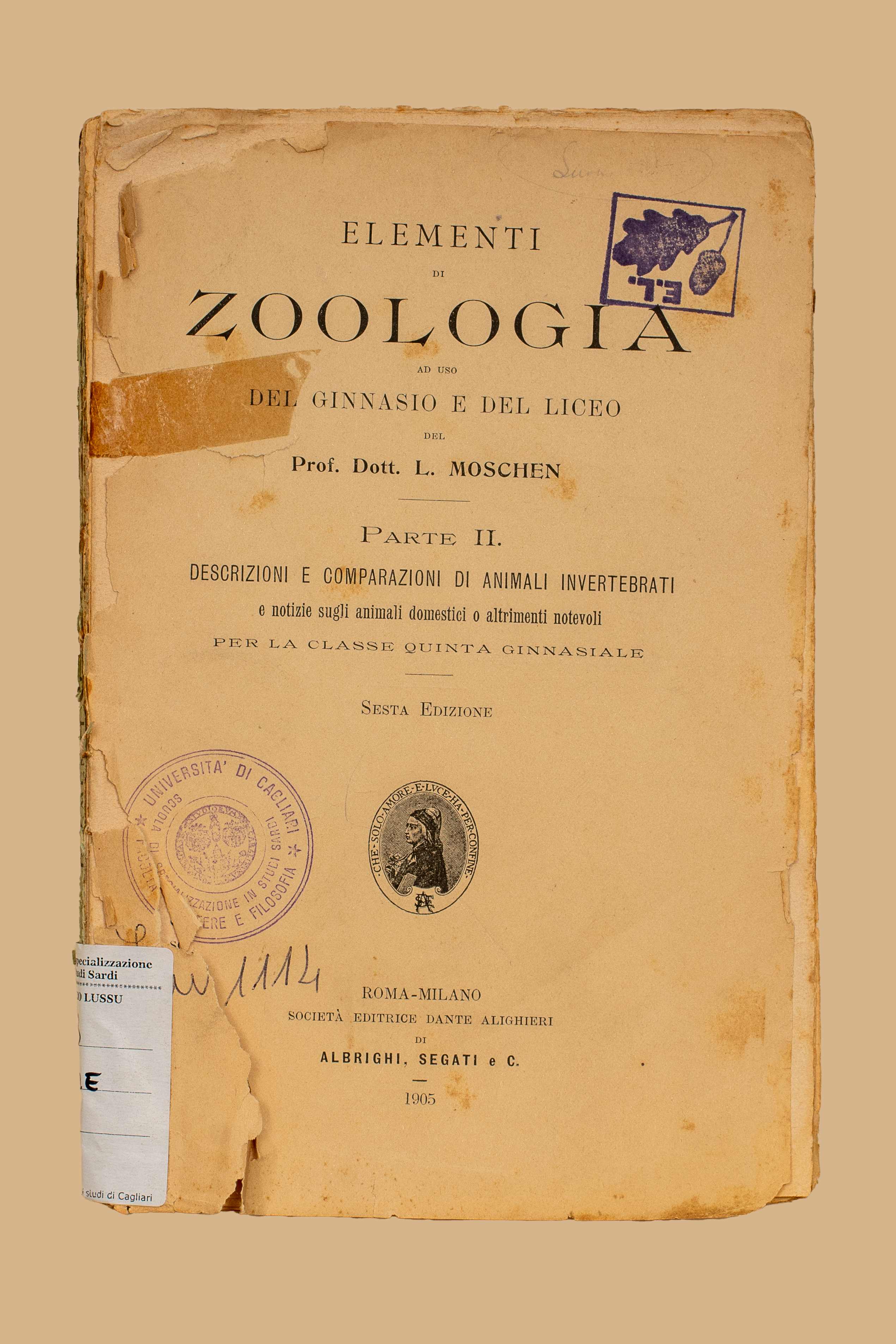 Titolo: Elementi di zoologia : ad uso del ginnasio e del liceo / Lamberto Moschen. Vol. 2: Descrizioni e comparazioni di animali invertebrati e notizie sugli animali domestici o altrimenti notevoli : per la classe 5. ginnasiale / L. Moschen. - 6. ed. - Roma ; Milano : Dante Alighieri, 1905. - 146 p. : ill. ; 21 cm.