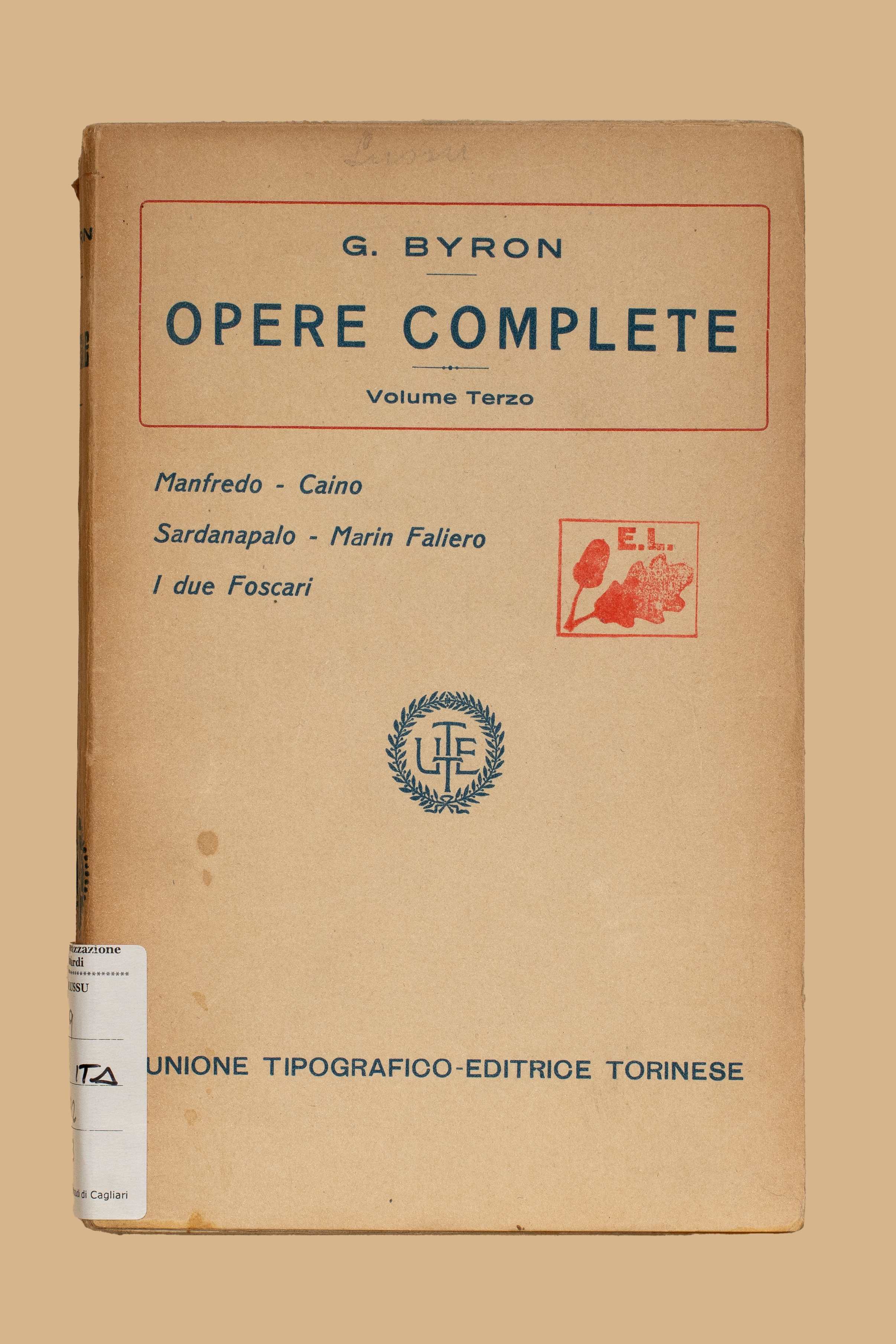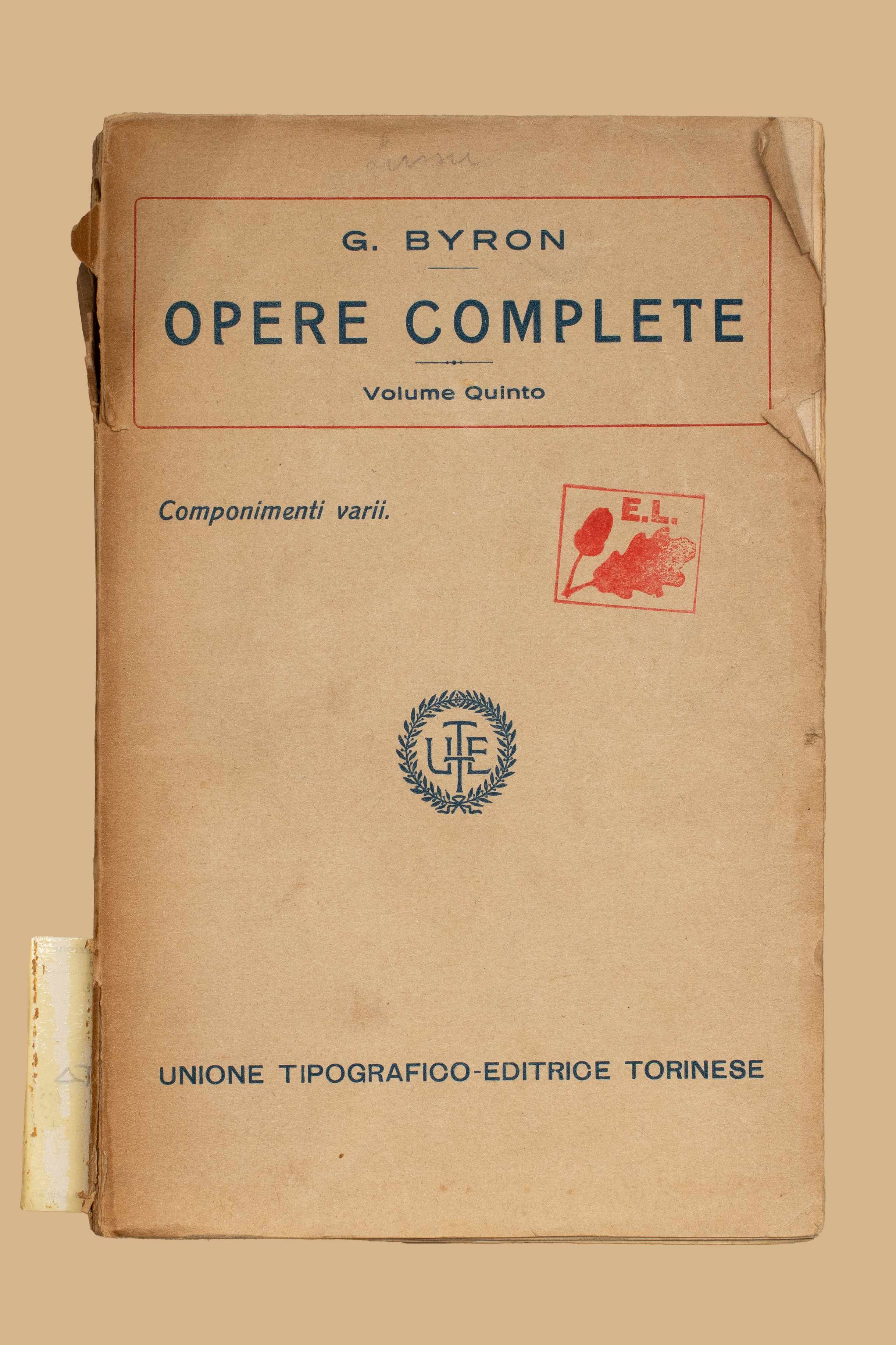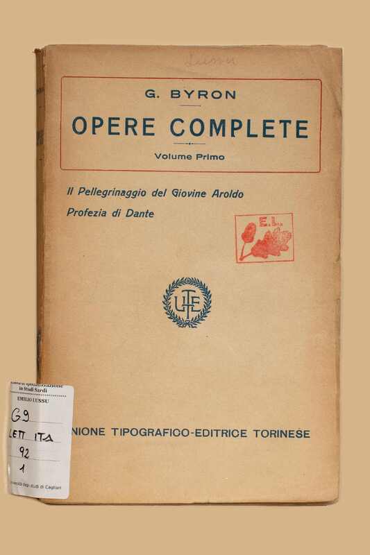 Titolo: Opere complete / Giorgio Byron. - Ed. definitiva.Torino : UTET. - 5 v. ; 20 cm. 1: Il pellegrinaggio del giovine Aroldo ; Profezia di Dante - 1917. 2: Il Giaurro ; La sposa d’Abido ; Il corsaro ; Lara ; L’assedio di Corinto ; Parisina ; Il prigioniero di Chillon ; Mazeppa ; L’isola ; Le lagrime ; L’addio ; Le tenebre ; Lamento del Tasso ; La morte di Calmar e d’Orla - 1917. 3: Manfredo ; Caino ; Sardanapalo ; Marino Faliero ; I due Foscari Byron. - 1917. 5: Componimenti varii / Giorgio Byron ; traduzione di Carlo Rusconi. - 1922.