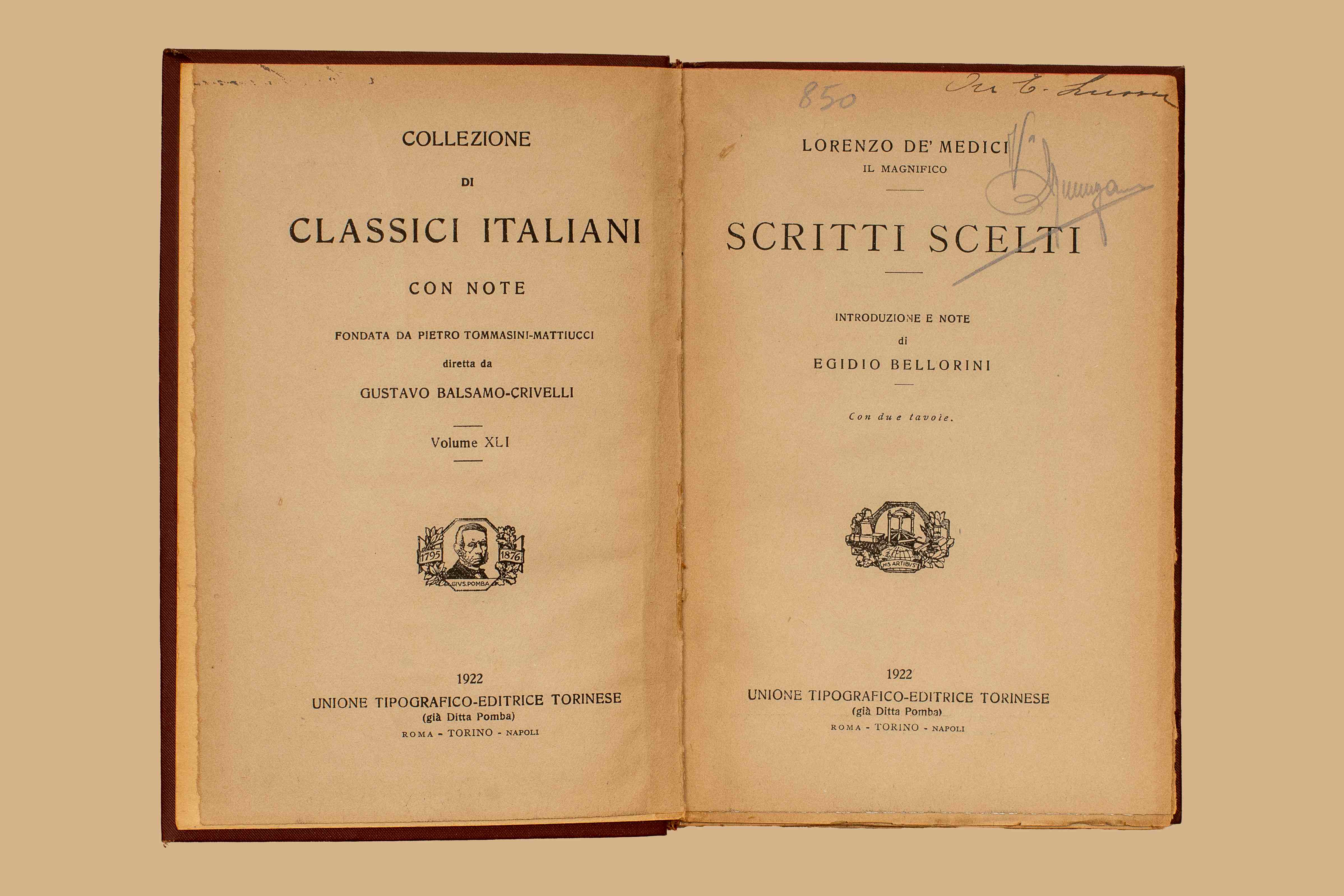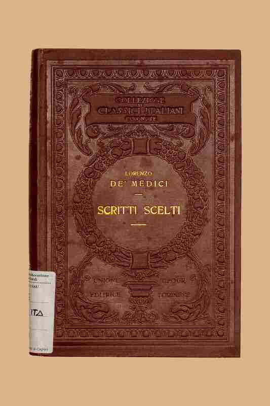 Titolo: Scritti scelti / Lorenzo de Medici il Magnifico ; introduzione e note di Egidio Bellorini. - Torino : Unione Tipografico-Editrice Torinese, 1922. - 267 p., 2 p. di tav. : ill., ritr. ; 19 cm. - (Collezione di classici italiani con note ; 41)