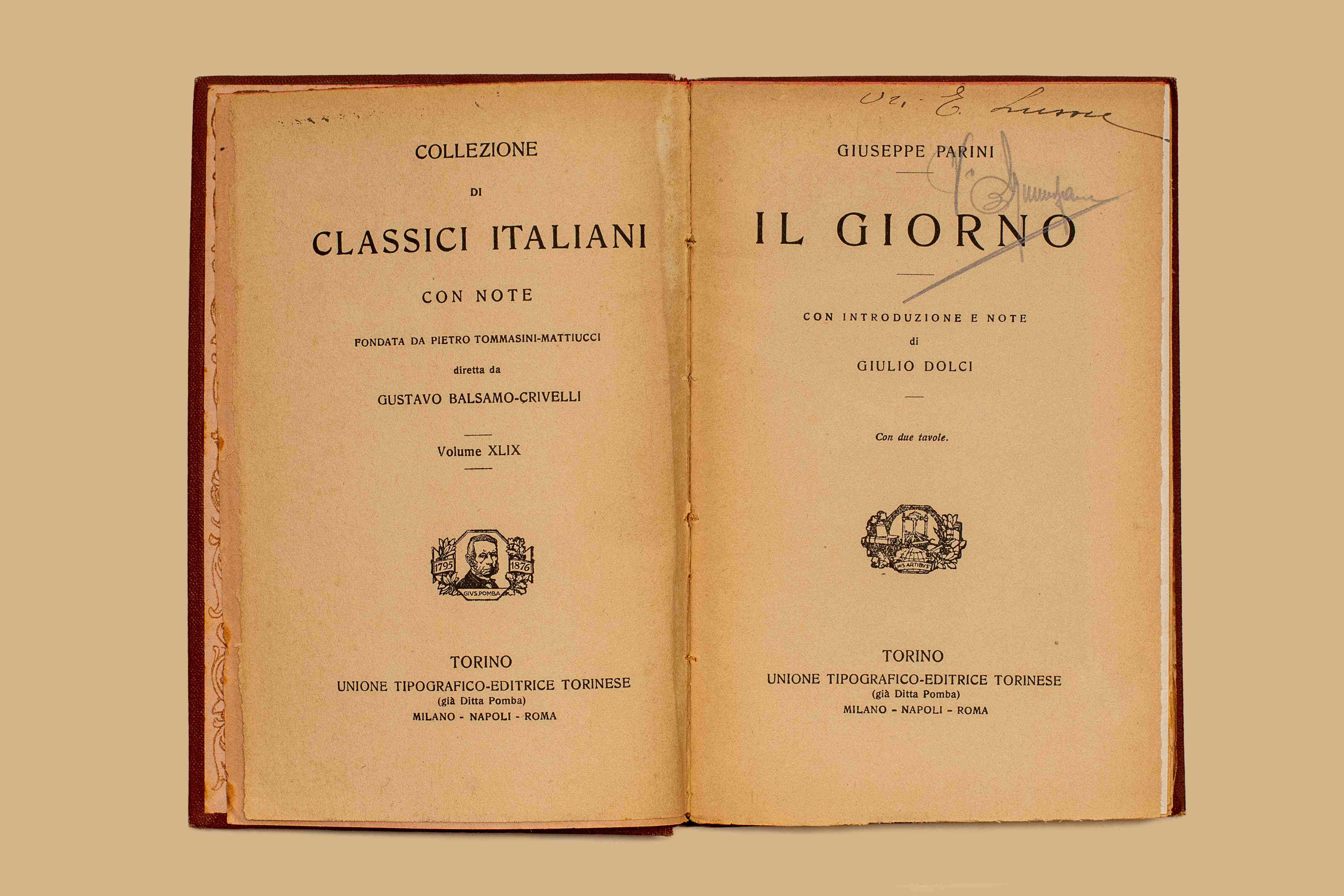 - Il giorno / Giuseppe Parini ; con introduzione e note di Giulio Dolci. Torino : UTET, 1922. - XXXVIII, 169 p., 2 p. di tav. : ill. ; 18 cm. - (Collezione di classici italiani con note ; 49)