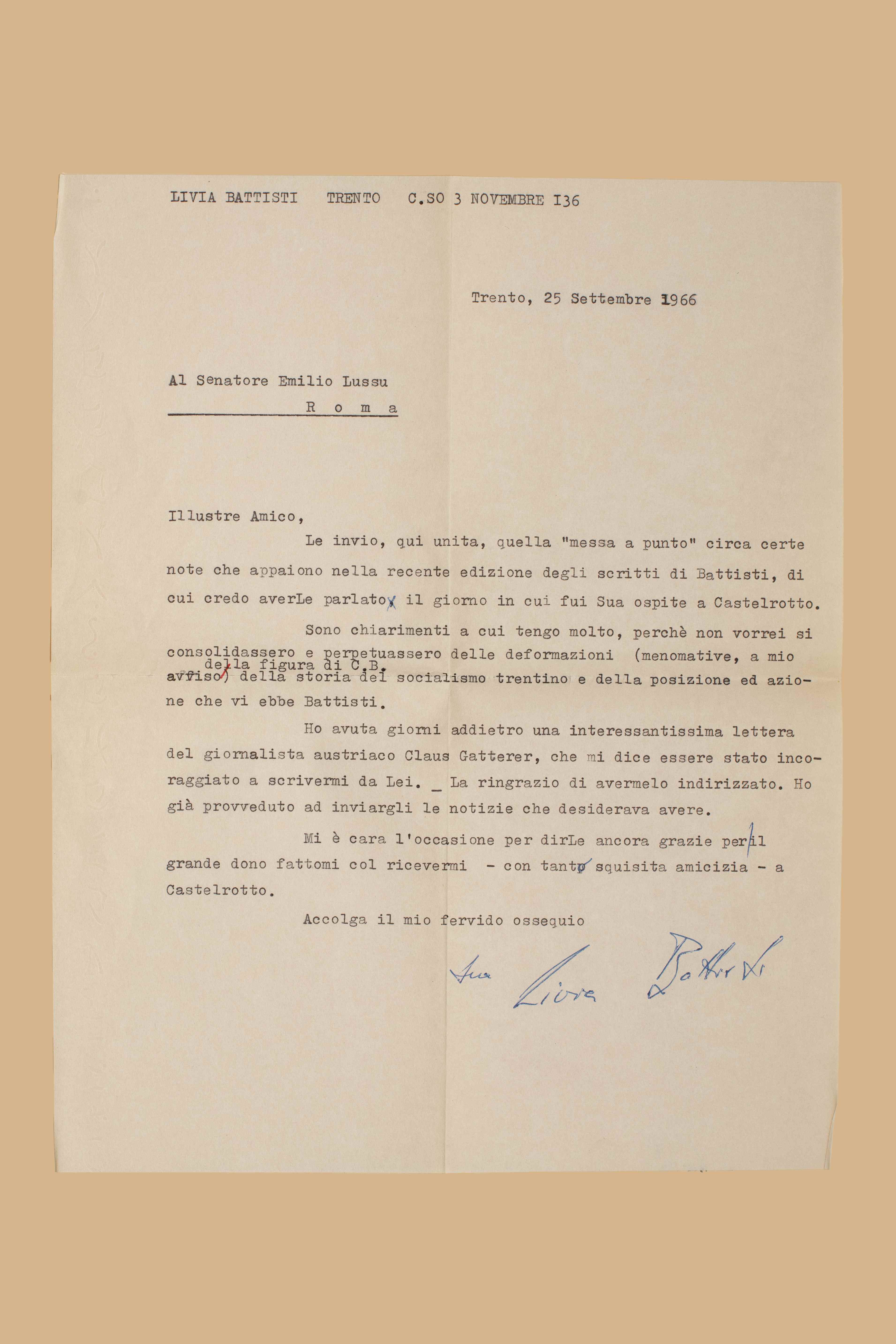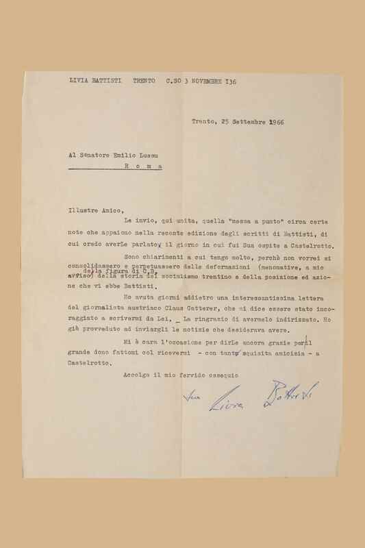 - Opuscolo di Livia Battisti: “Alcune addenda alle note dell’edizione cinquantenaria di scritti di Cesare Battisti (La Nuova Italia ed. 1966)", Firenze, La Nuova Italia, 1966 con lettera di accompagnamento di Livia Battisti, dat. Trento, 25.9.66.