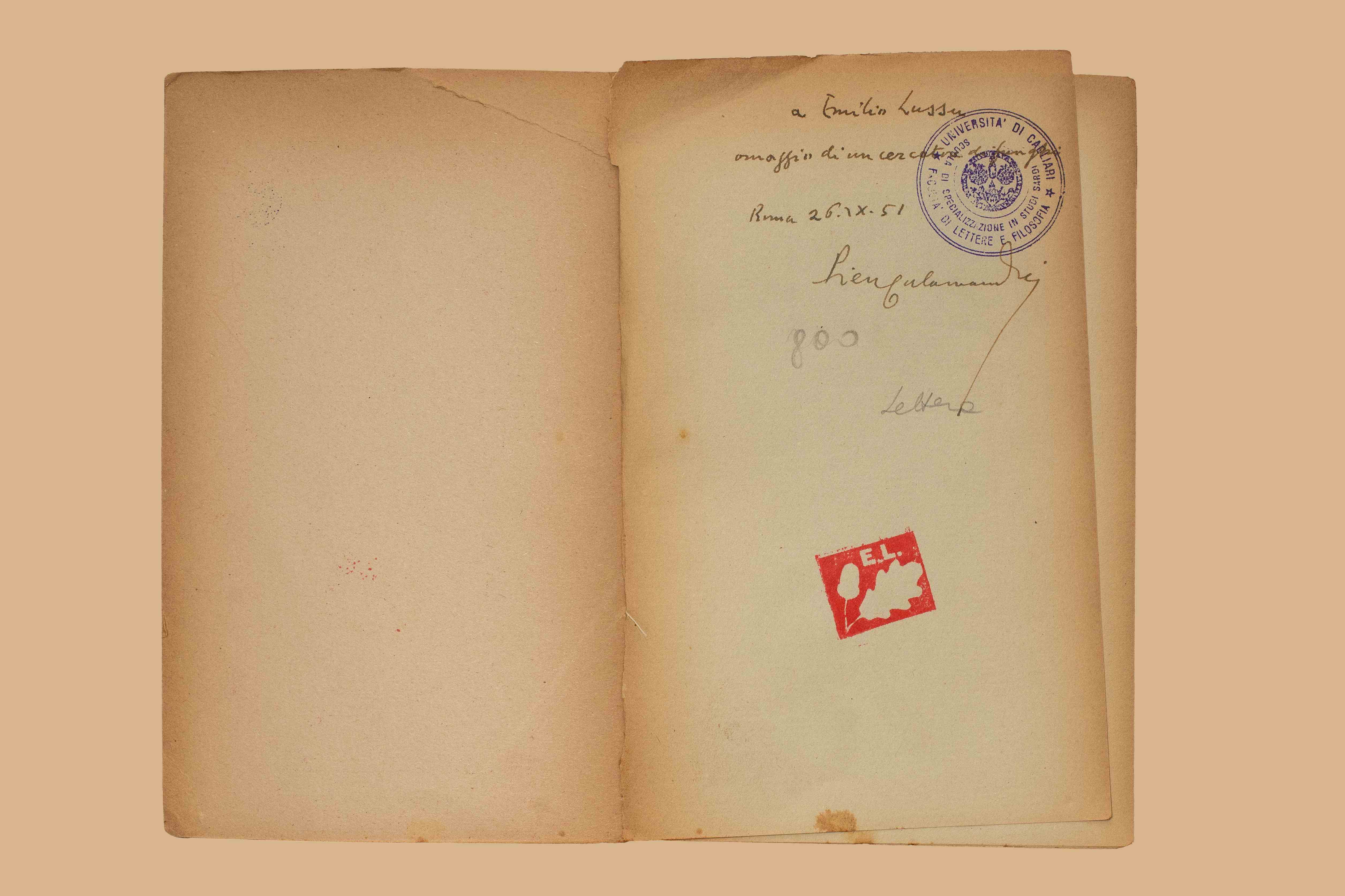 - Nel risguardo dedica ms. dell'a. “A Emilio Lussu, omaggio di un cercatore di funghi. Roma, 29.IX.51. Piero Calamandrei”