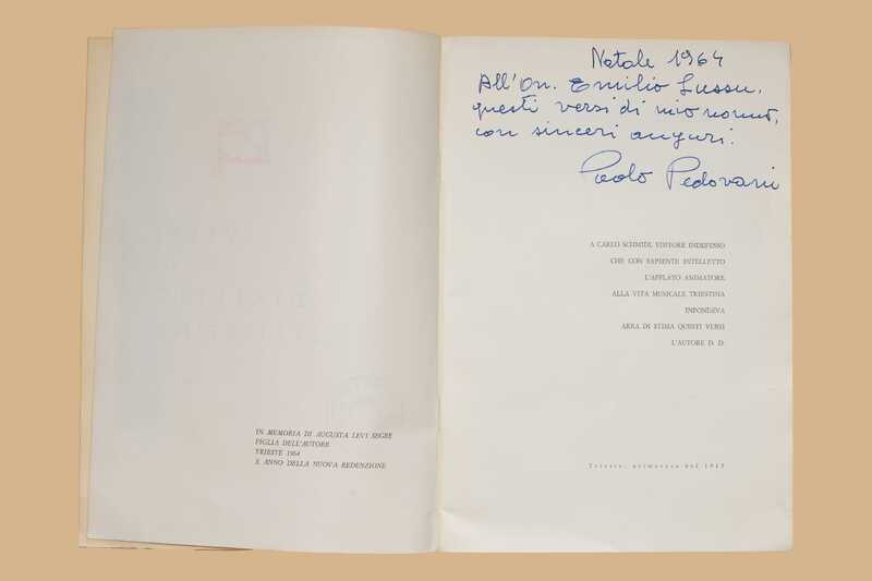 Note: A p. 3. dedica ms. “Natale 1964. All’On. Emilio Lussu, questi versi di mio nonno con sinceri auguri, Paolo Padovani”. Incollato con una strisciolina di tela alla copertina anteriore un ritaglio de «Il Piccolo» del 30 settembre 1964 che dà notizia della pubblicazione (a beneficio della Lega) del volume di poesie di Augusto Levi, poeta e giornalista triestino, figura importante dell’irredentismo. Incollato con una strisciolina di tela alla copertina posteriore un ritaglio di giornale che commemora la morte di Augusta Segré nata Levi, figlia di Augusto.