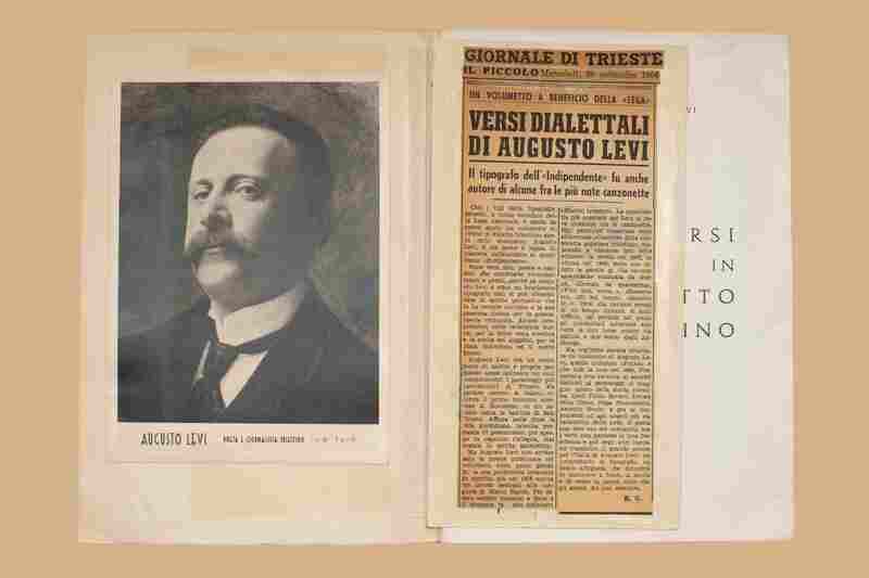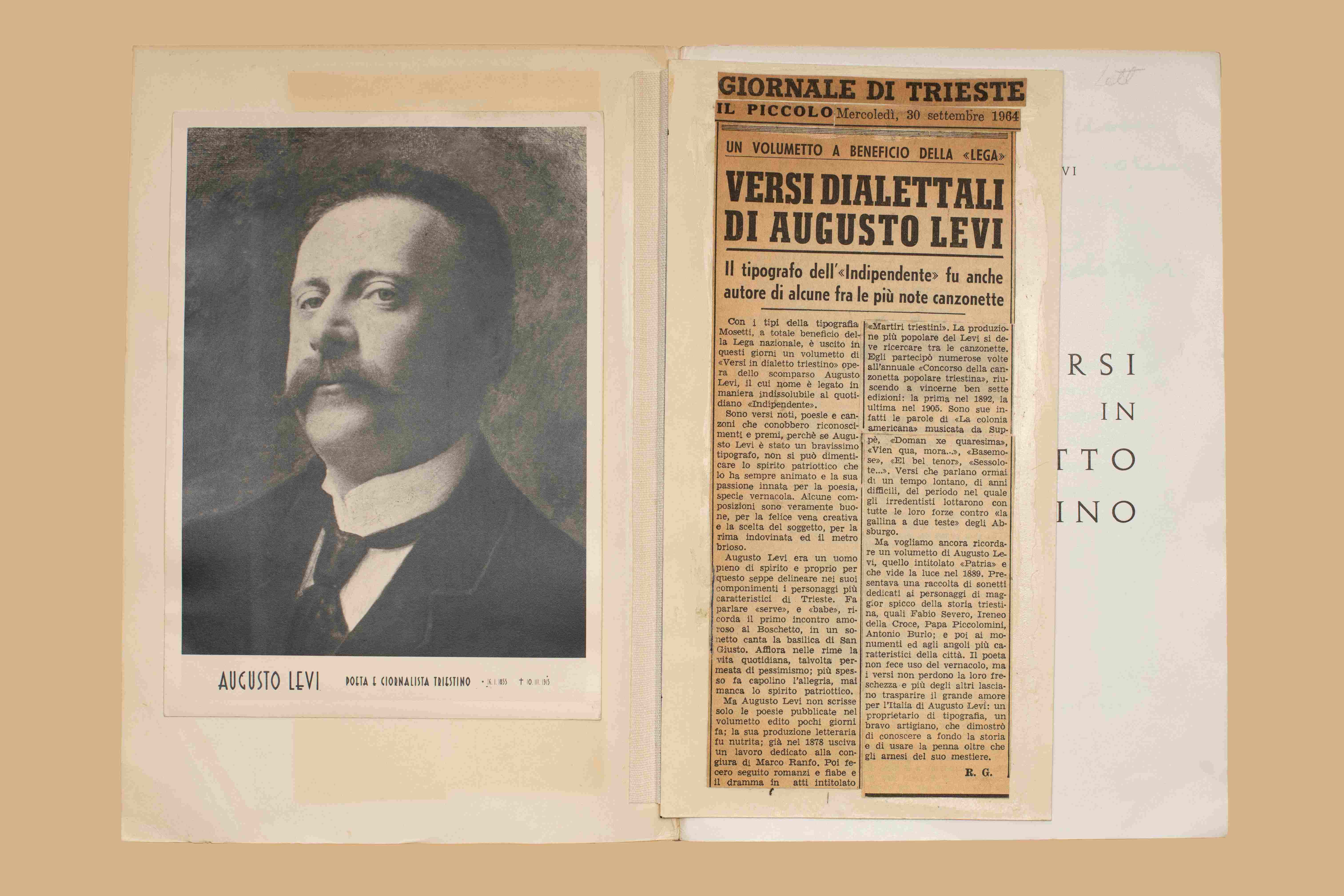 - A p. 3. dedica ms. “Natale 1964. All’On. Emilio Lussu, questi versi di mio nonno con sinceri auguri, Paolo Padovani”. Incollato con una strisciolina di tela alla copertina anteriore un ritaglio de «Il Piccolo» del 30 settembre 1964 che dà notizia della pubblicazione (a beneficio della Lega) del volume di poesie di Augusto Levi, poeta e giornalista triestino, figura importante dell’irredentismo. Incollato con una strisciolina di tela alla copertina posteriore un ritaglio di giornale che commemora la morte di Augusta Segré nata Levi, figlia di Augusto.