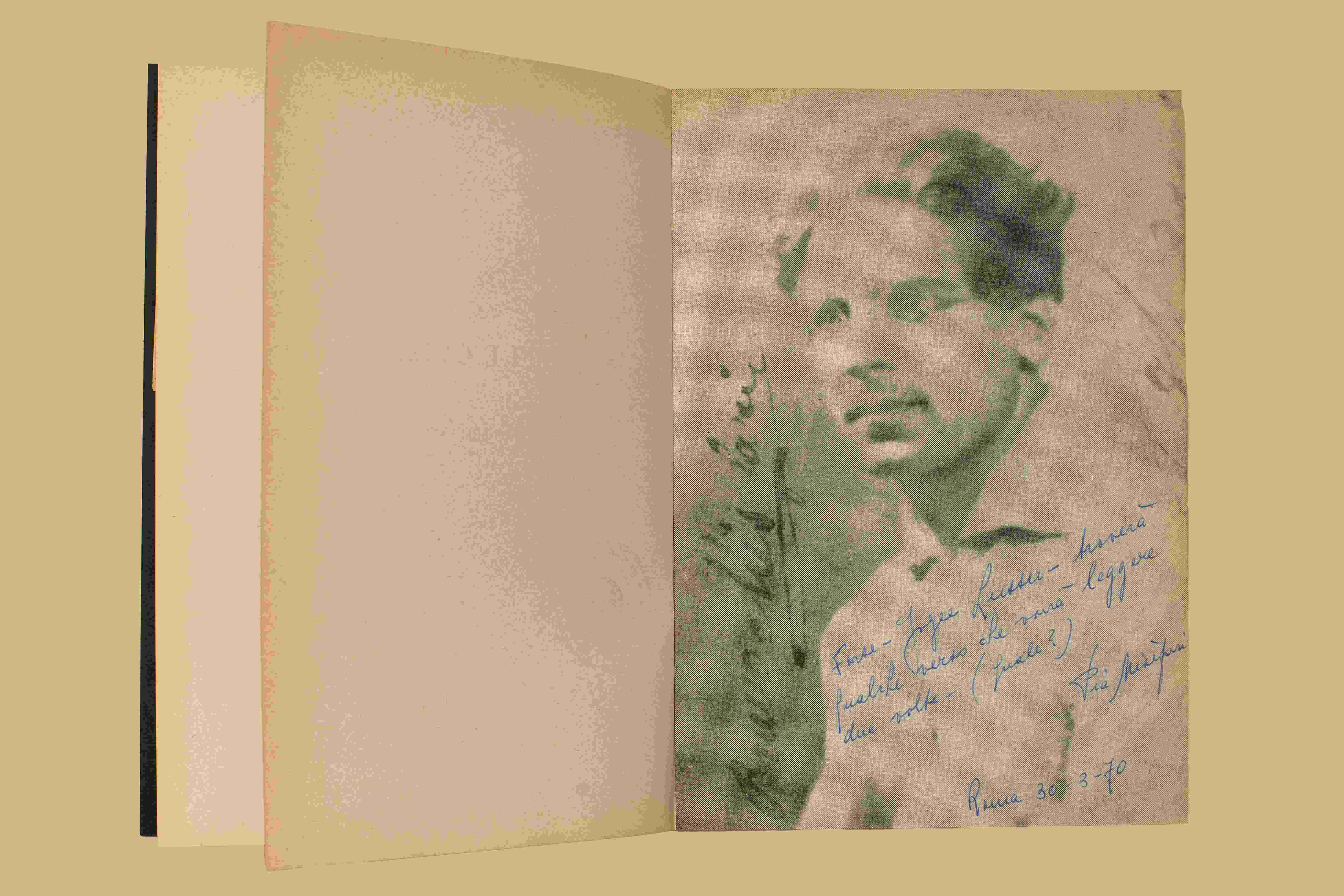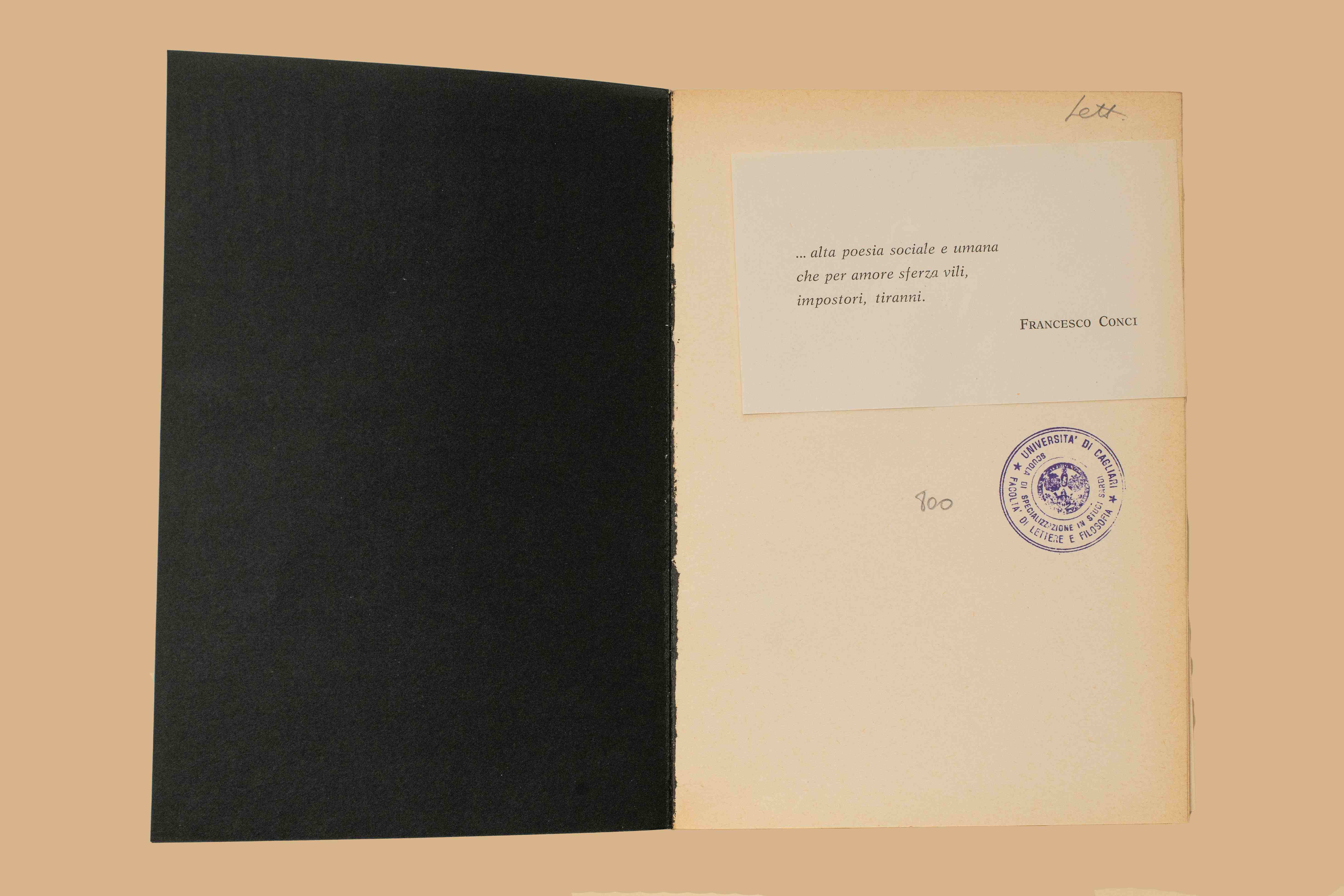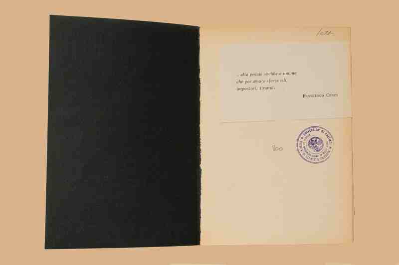 - Nell'occhietto tassello di carta incollato con nota ds. "… alta poesia sociale e umana che per amore sferza vili, impostori, tiranni. Francesco Conci". Dopo il frontespizio fotografia dell’autore con una dedica ms. dat. Roma 30.3.70 “Forse - Joyce Lussu - troverà qualche verso che vorrà leggere due volte (quale?). Pia Misefari”. All'interno foglietto ds. contenente la poesia "Son la fontana" di Lorenzo Stecchetti (Olindo Guerrini).