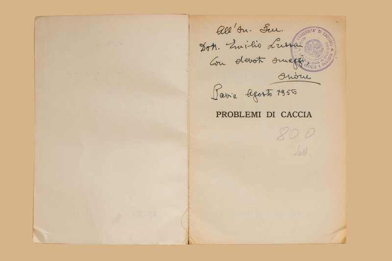 Note: Nell’occhietto ms. “All’On. Sen. Dott. Emilio Lussu, con devoto omaggio, Orione. Pavia, agosto 1956”. Biglietto dell’autore, Vittorio Necchi, dat. Pavia, agosto 1956 che afferma di avere avuto indicazione di una adesione di Lussu al “gruppo senatoriale Amici della caccia” e di inviargli pertanto il libro in omaggio, libro nato dalla convinzione che molto può essere fatto per salvare la caccia in Italia.