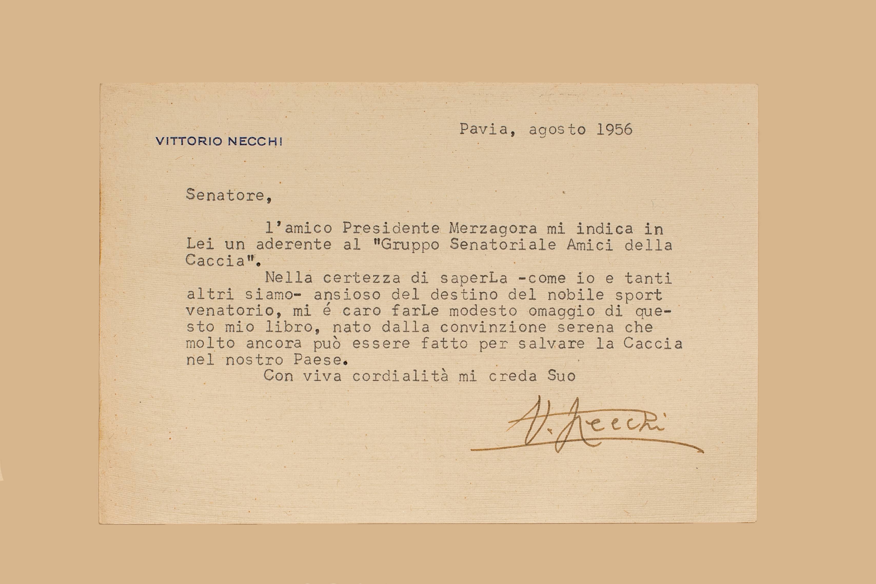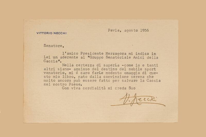 - Nell’occhietto ms. “All’On. Sen. Dott. Emilio Lussu, con devoto omaggio, Orione. Pavia, agosto 1956”. Biglietto dell’autore, Vittorio Necchi, dat. Pavia, agosto 1956 che afferma di avere avuto indicazione di una adesione di Lussu al “gruppo senatoriale Amici della caccia” e di inviargli pertanto il libro in omaggio, libro nato dalla convinzione che molto può essere fatto per salvare la caccia in Italia.