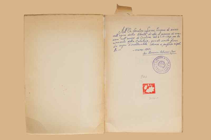 Note: Nell’occhietto dedica ms. dell’a. “All’On. Senatore Lussu, tempra di acciaio nell’agone della libertà, ch’ebbi il piacere di conoscere nell’assise di Crotone del 4-12-1949 per la rinascita della Calabria, questo umile fiore in segno d’inalterabile stima e profondo rispetto. Marzo 1967, Sac. Domenico Palmieri-Tucci”. Ricevuta del vaglia postale di £ 1000 (il prezzo del libro) eseguito dall’Ufficio di Roma Senato a favore dell’a., dat. 13.4.1967.