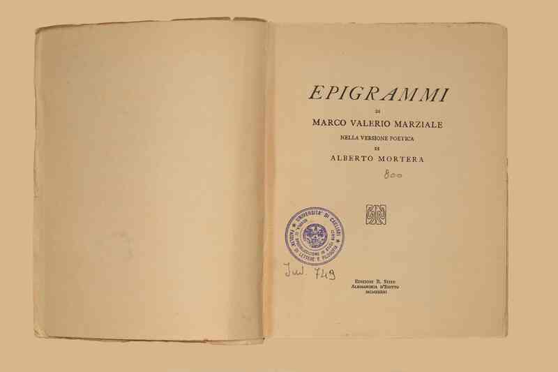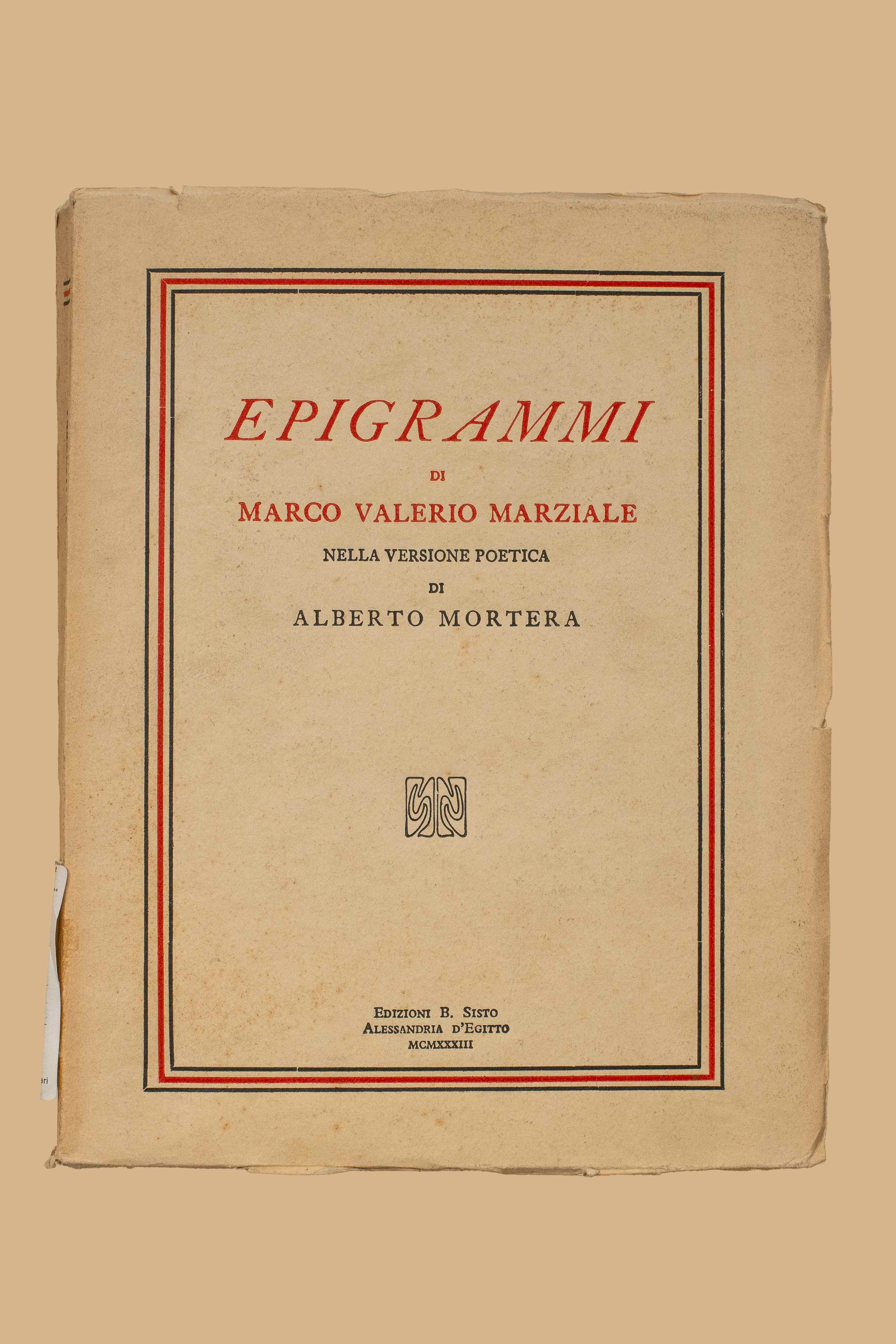 - Epigrammi / di Marco Valerio Marziale ; nella versione poetica di Alberto Mortera. - Alessandria d'Egitto : B. Sisto, 1933. - XXV, 270 p. ; 20 cm.
