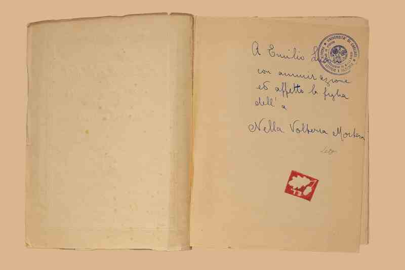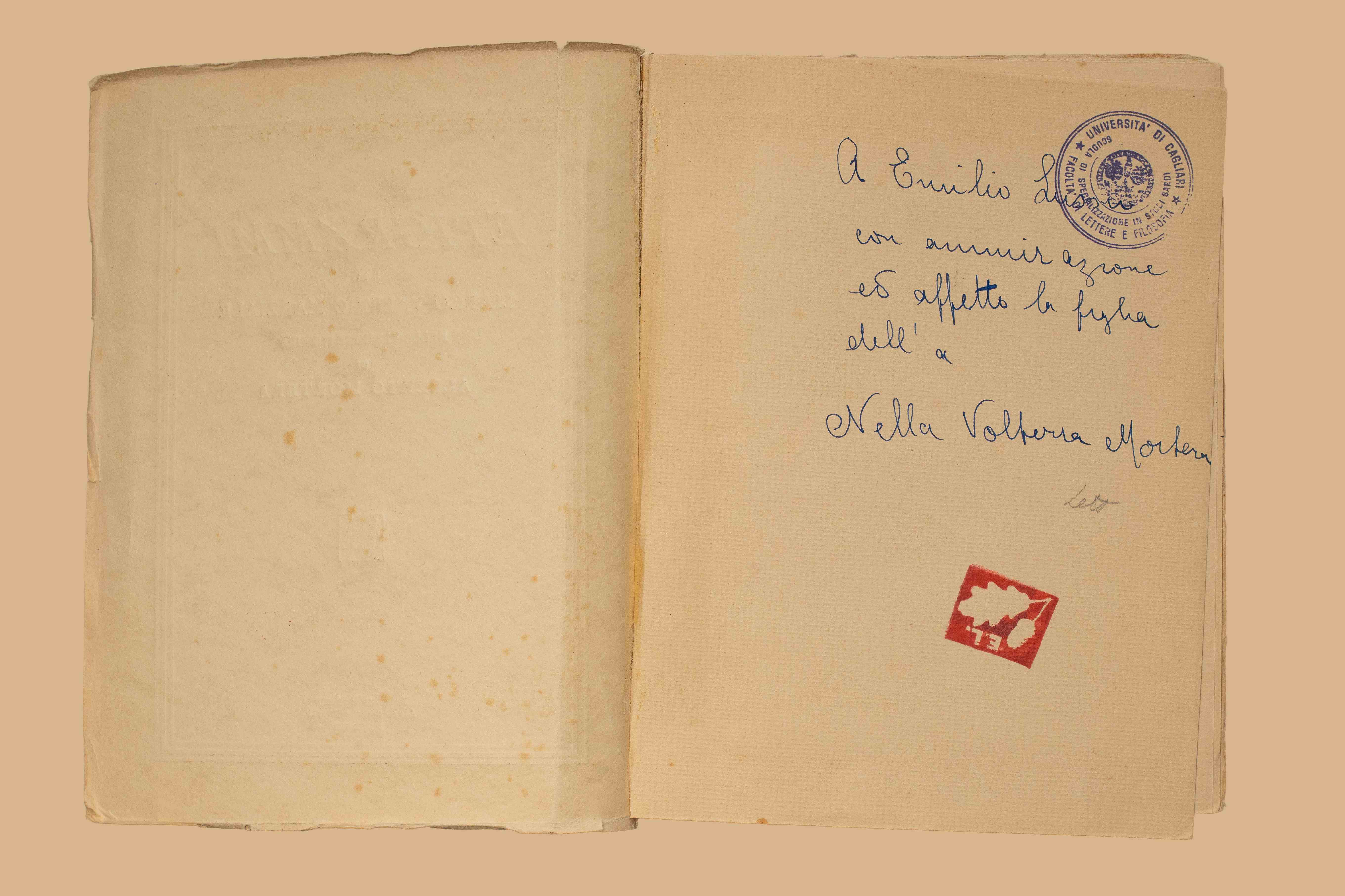 Note: Dedica ms. nell’occhietto: “A Emilio Lussu con ammirazione e affetto, la figlia dell’a. Nella Volterra Mortera”. Cartolina, dat. Baghdad, 19/10/65 indirizzata a Joyce Lussu.
