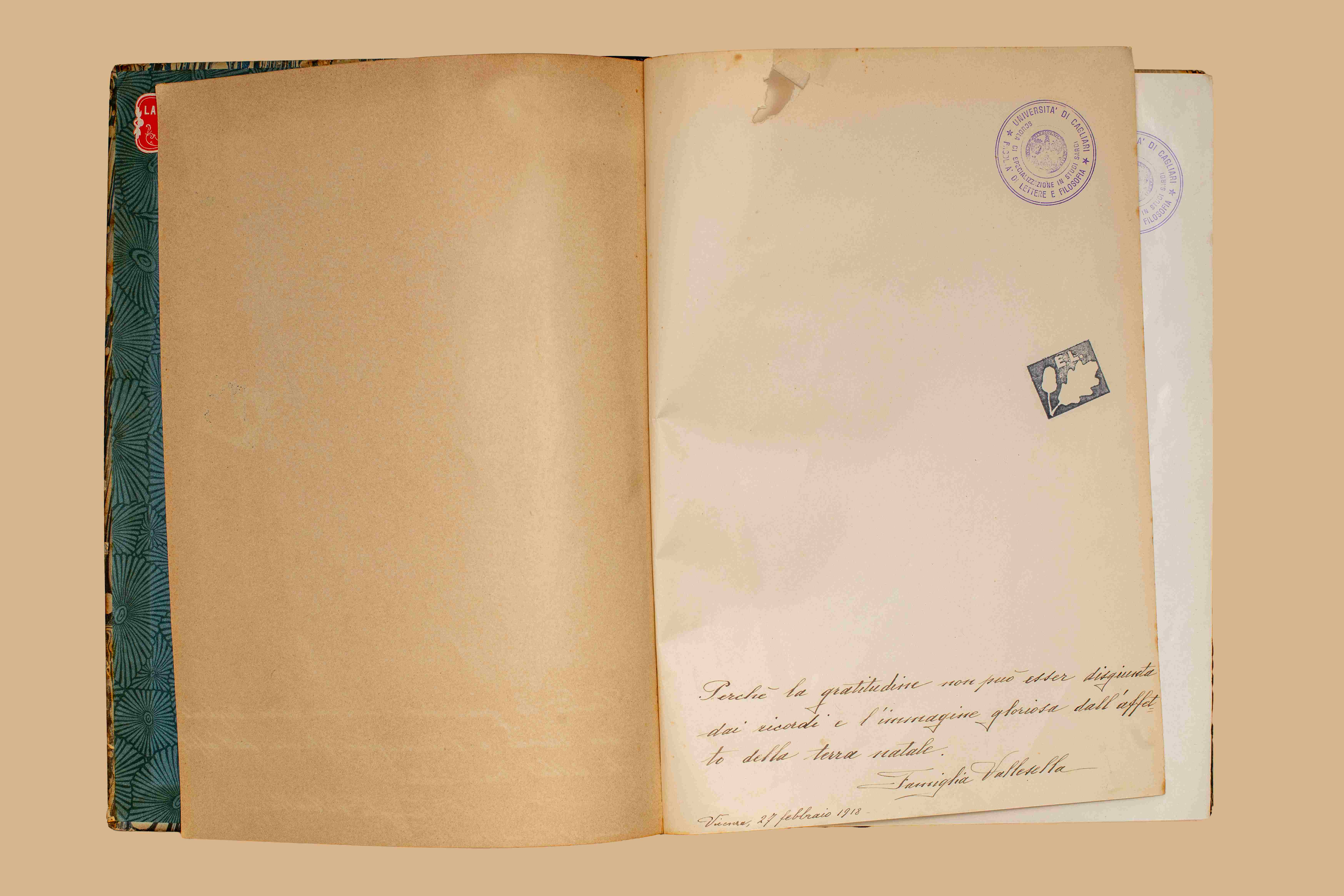 - Legatura in mezza pelle con dorso nero e piatti marmorizzati azzurri e grigi. All’interno del piatto ant. adesivo “La cartolibraria. Via Cavour. Vicenza”. Nel risguardo dedica ms. “Perché la gratitudine non può esser disgiunta dai ricordi e l’immagine gloriosa dall’affetto della terra natale. Famiglia Vallesella. Vicenza, 27 febbraio 1918”.