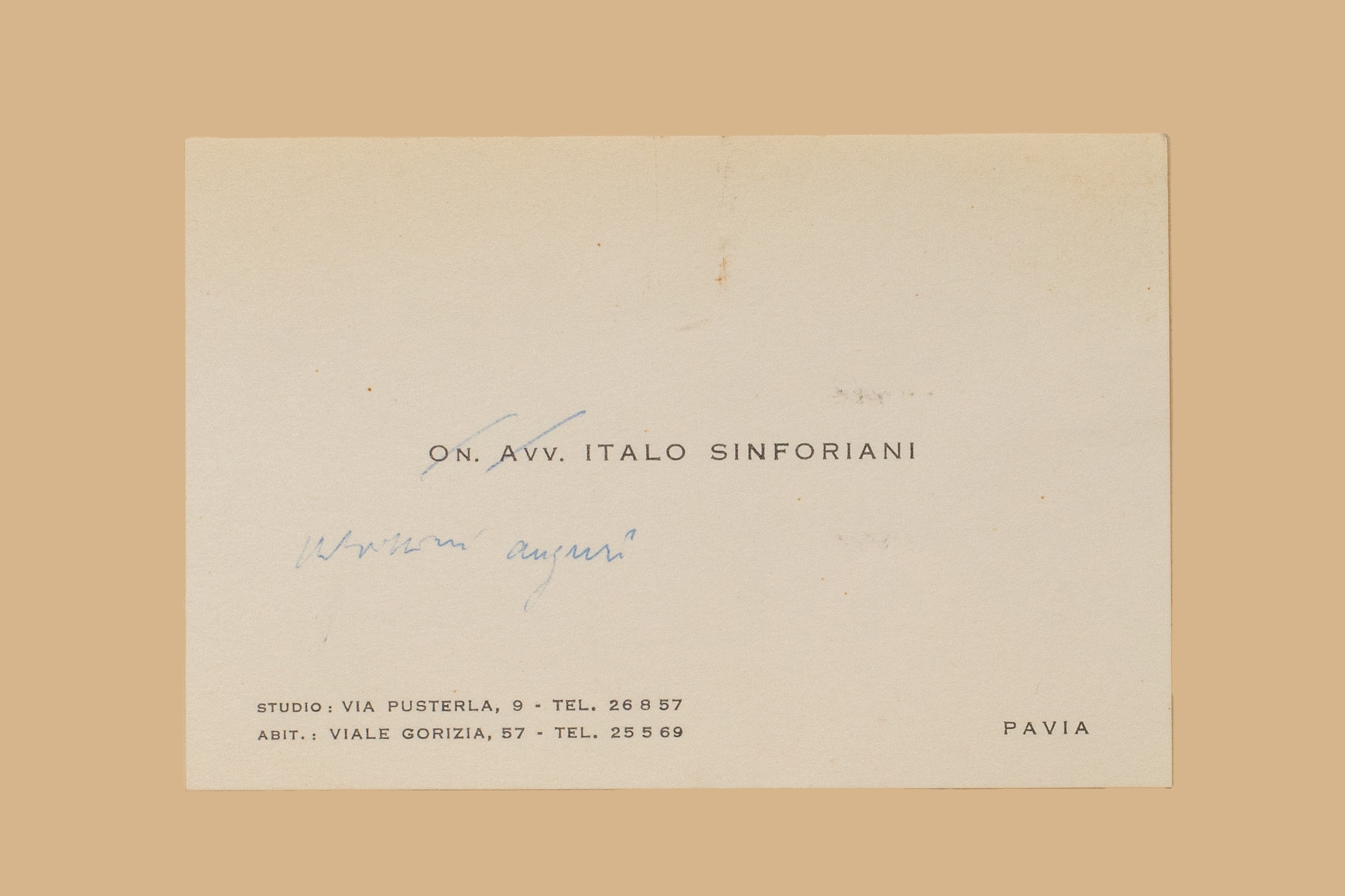 - Nella cop. ms. “Al caro e indimenticabile Emilio, questo ricordo di mio padre. I. Sinforiani”. Biglietto da visita di Italo Sinforiani, avvocato pavese, con nota ms. “Vivissimi auguri”.