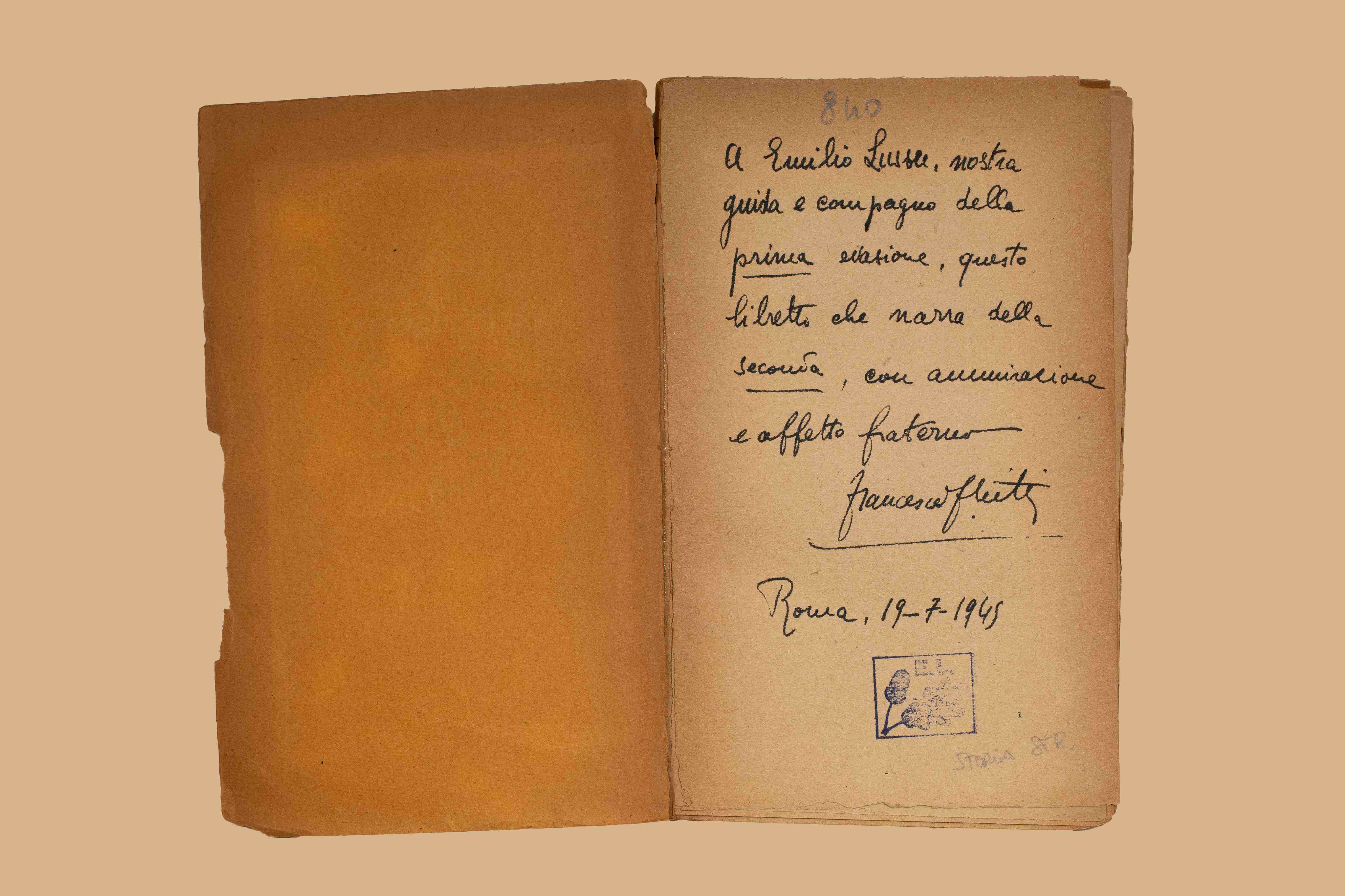 - Nella p. che precedei il front. "A Emilio Lussu, nostra guida e compagno della prima (sottolineato) evasione, questo libretto che narra della (sottolineato) seconda, con ammirazione e affetto fraterno, Francesco Nitti, Roma 19-7-1945".