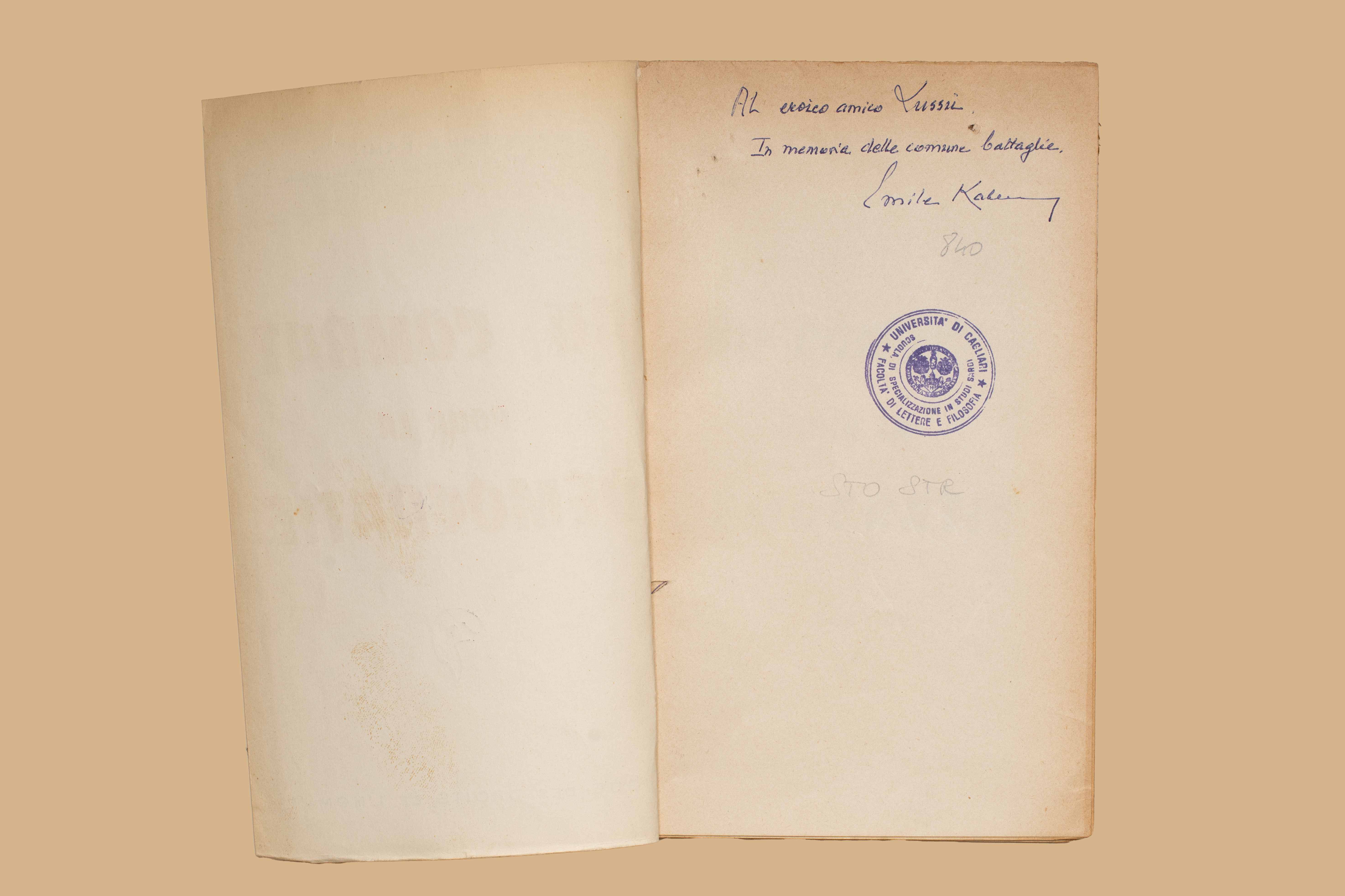 Note: Dedica dell'a.: "All'eroico amico Lussu. In memoria delle comuni battaglie, Emile Kahn". Cartolina di Beppa T. [Giuseppina Nardari, moglie di Silvio Trentin], dat. Venezia, 1958.