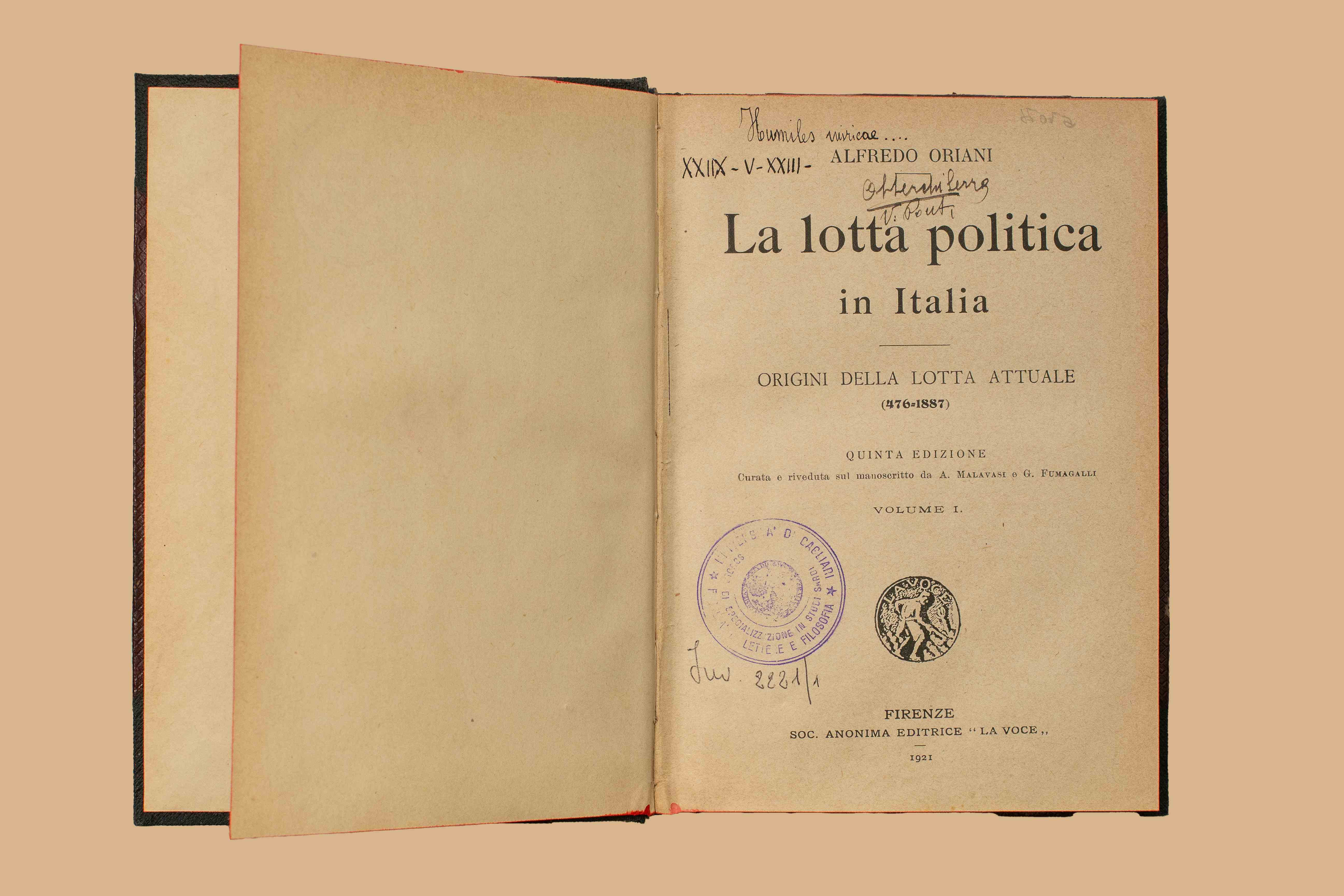 Titolo: La lotta politica in Italia : origini della lotta attuale : 476-1887 / Alfredo Oriani. - 5. ed. / curata e riveduta sul manoscritto da A. Malavasi e G. Fumagalli. - Firenze : La Voce, 1921. - 3 v. ; 20 cm.