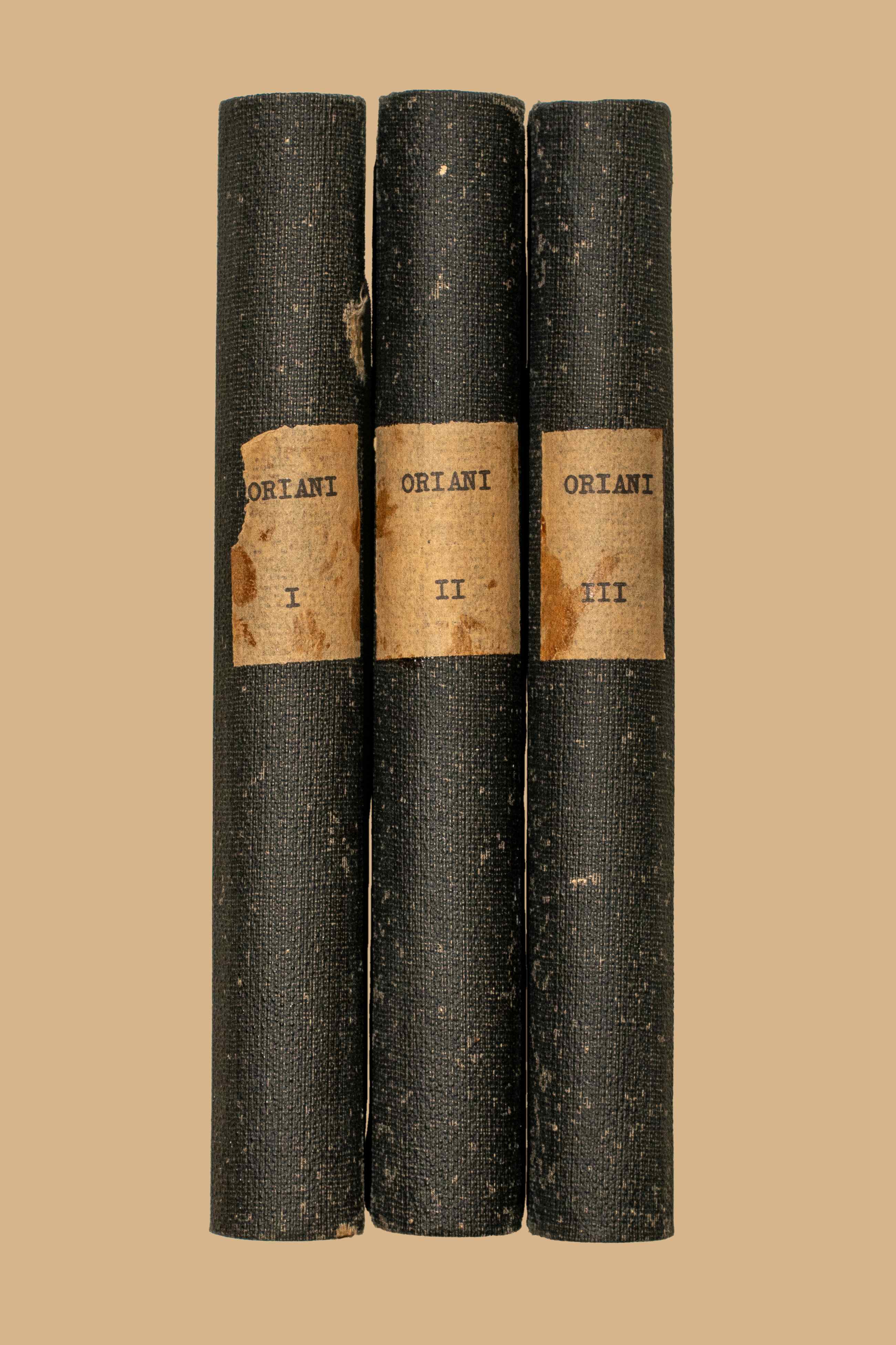 - Mezza legatura con dorso nero e piatti amaranto. Cartellino ds. sul dorso “Oriani I[-III]”. Nel front. del vol. ms. 1 “Humiles miricae. XXIIX-V.XXIII”.