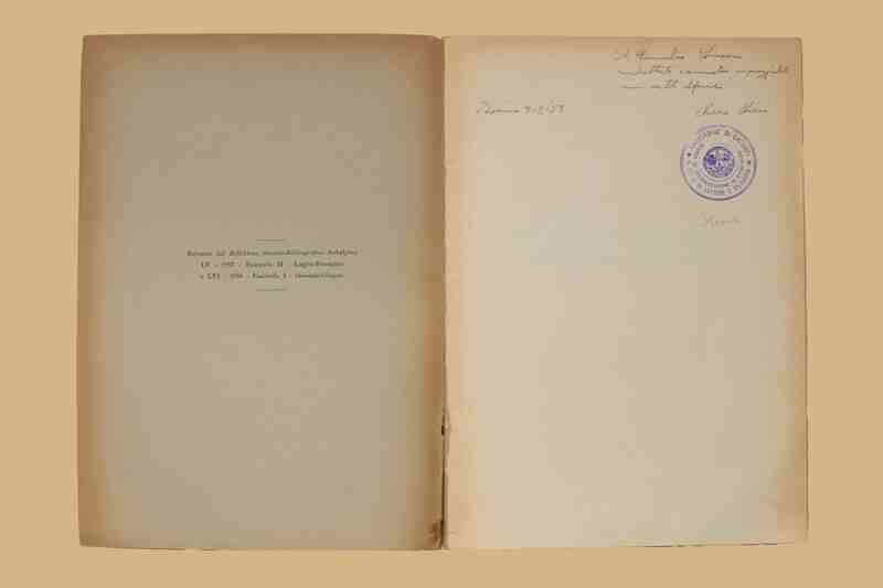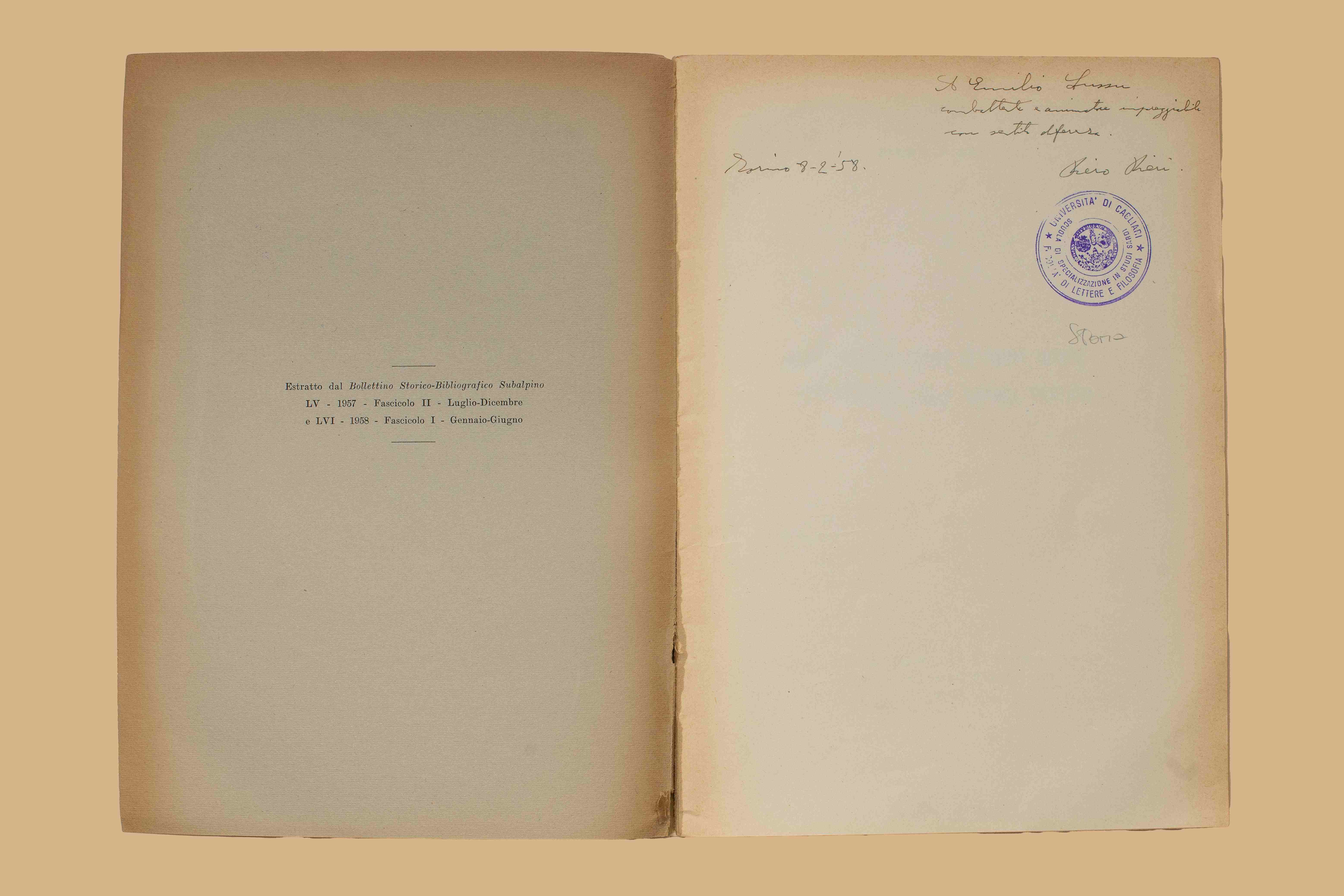 - Nell'occhietto dedica ms. dell'a. ”A Emilio Lussu combattente e animatore impareggiabile con sentita deferenza, Torino 8.2.'58. Piero Pieri”.