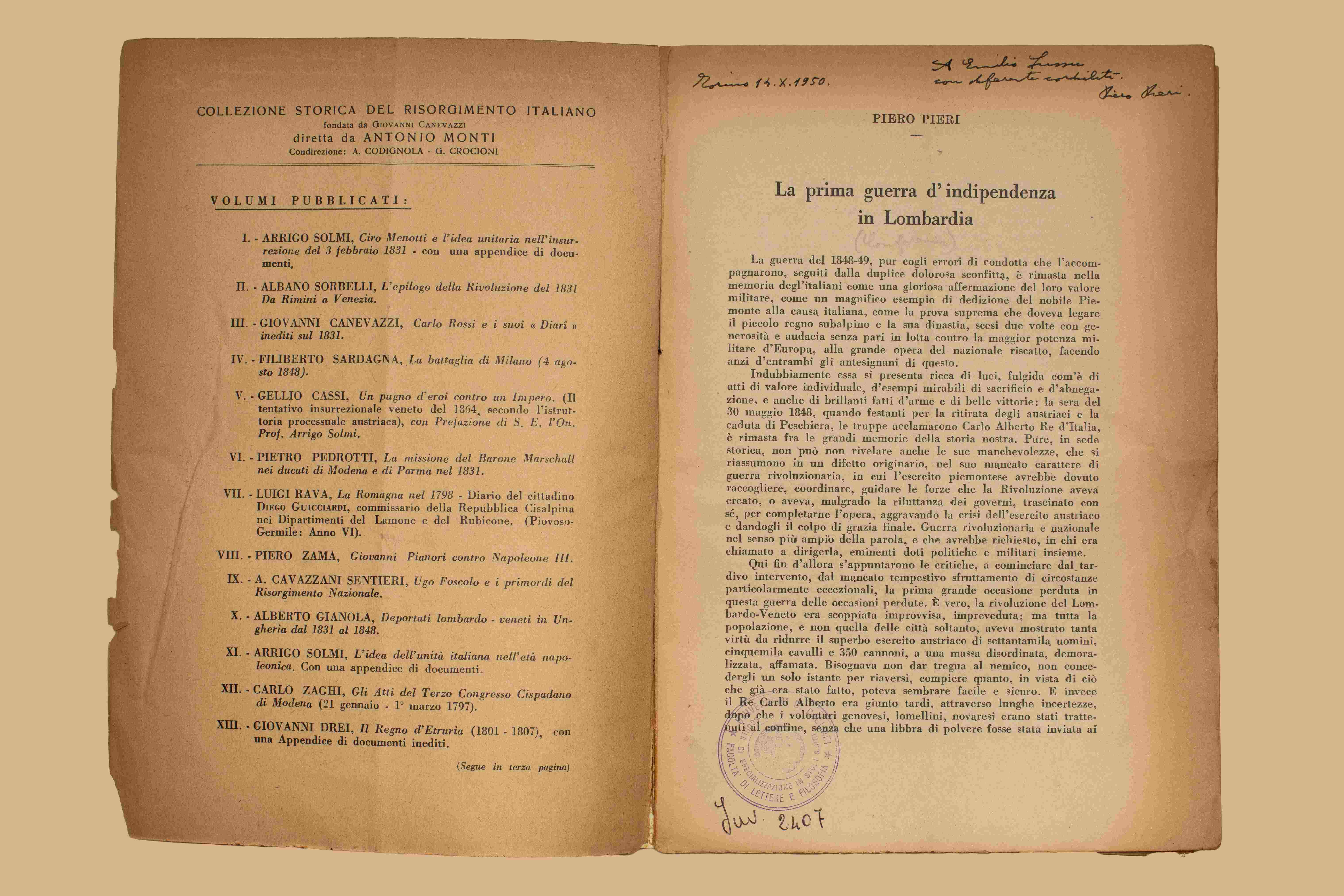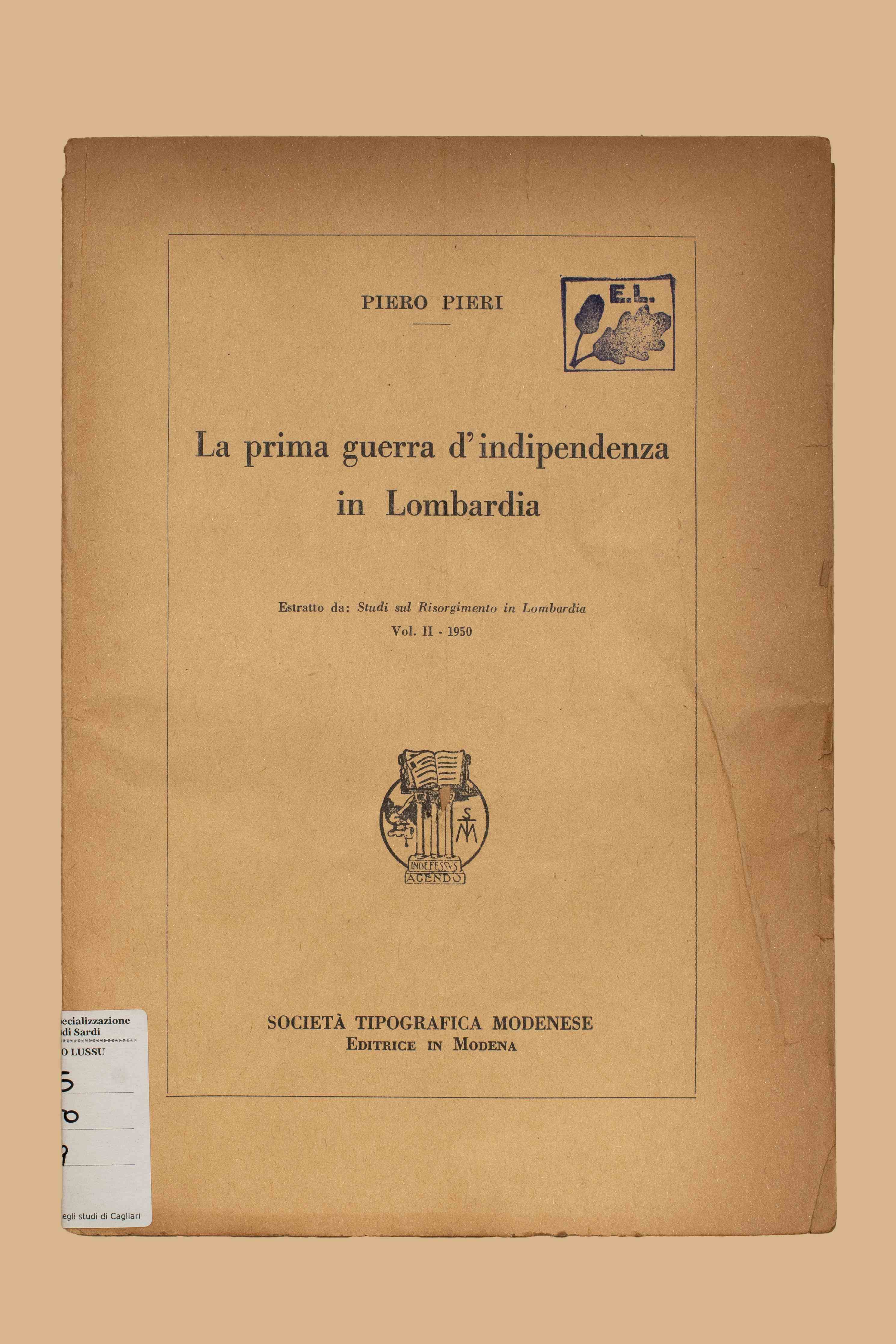 Titolo: La prima guerra d'indipendenza in Lombardia / Piero Pieri. - Modena : Società tipografica modenese, [1950?]. - 20 p. ; 25 cm. - Estr. da: Studi sul Risorgimento in Lombardia, vol. II, 1950.