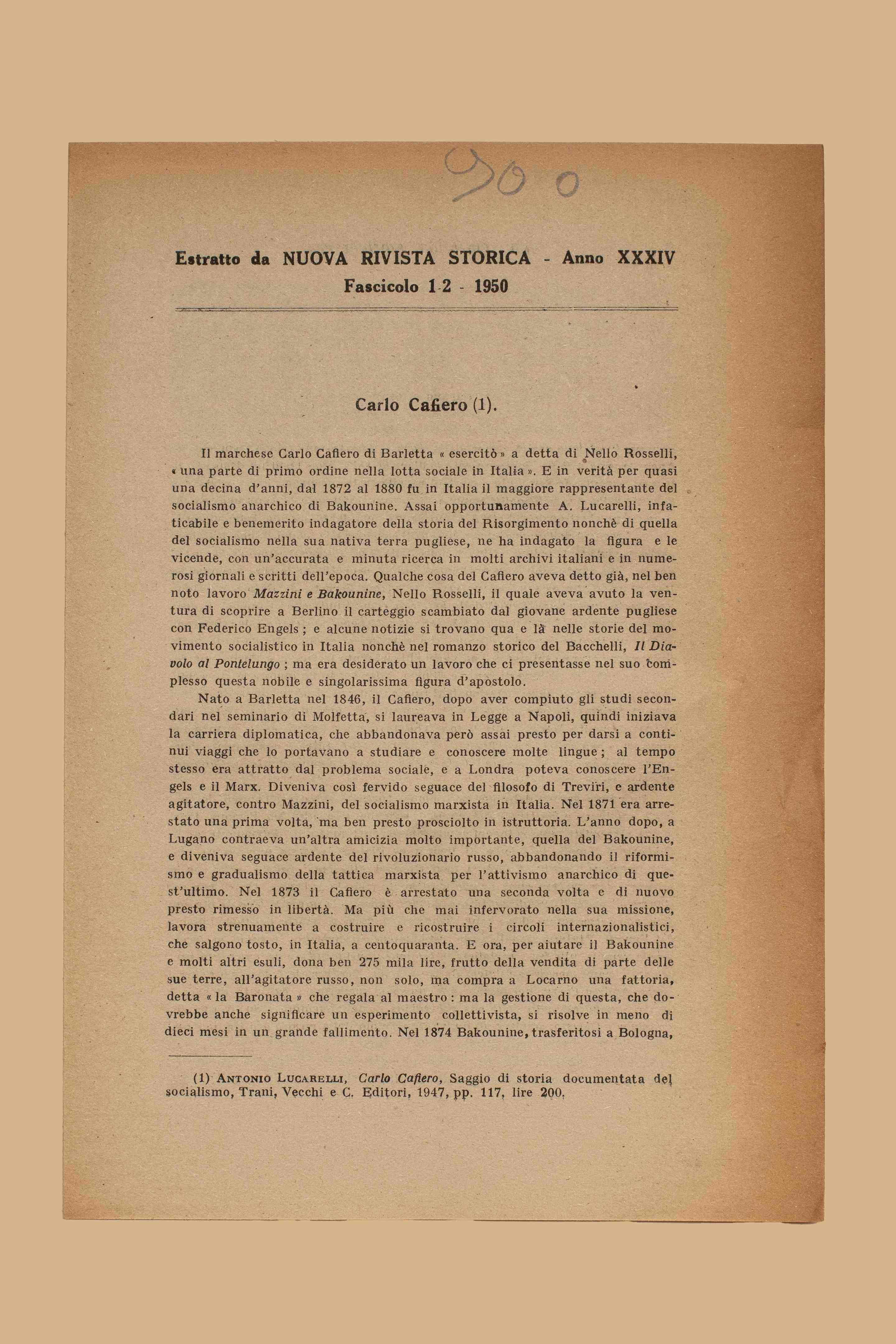 - Dedica ms. dell'a., dat. 14.X.1950; Aggiunti due saggi dell'a. per la "Nuova Rivista Storica": la recensione a A. Lucarelli, Carlo Cafiero, Trani, 1947 e il Necrologio di A. Omodeo, rispettivamente del 1950 e del 1946.
