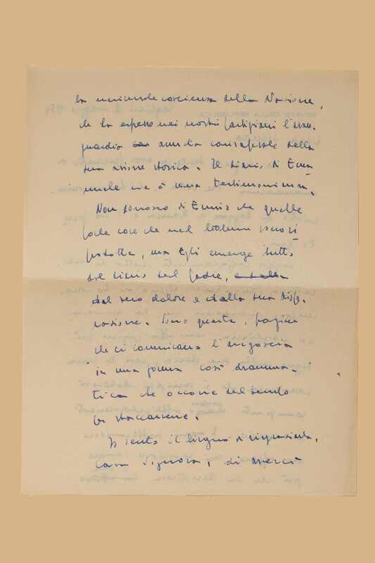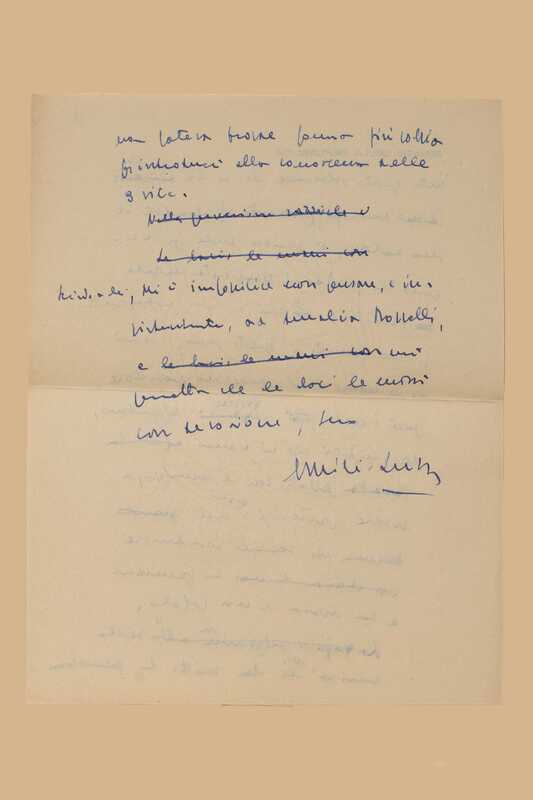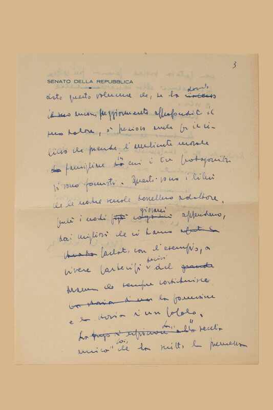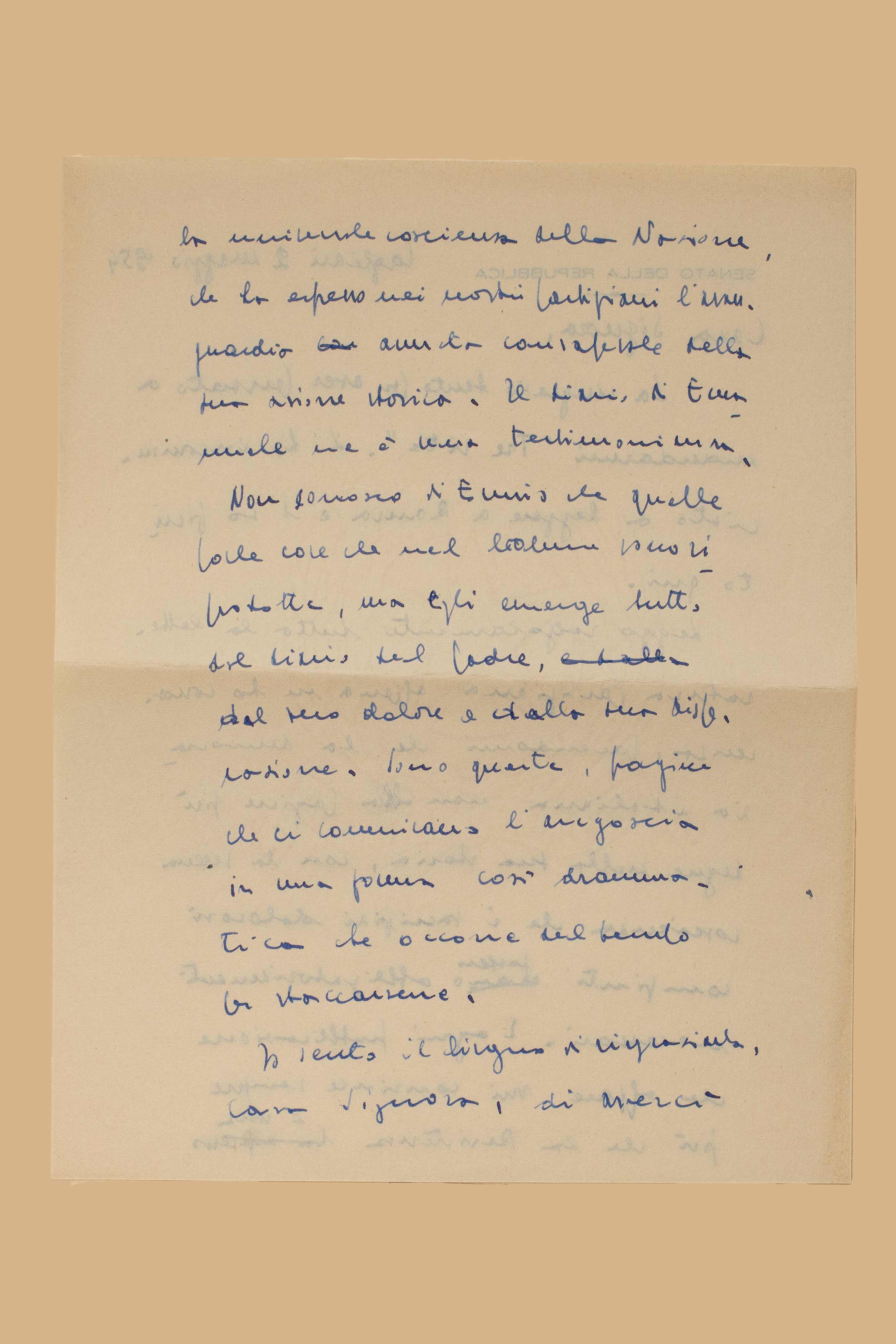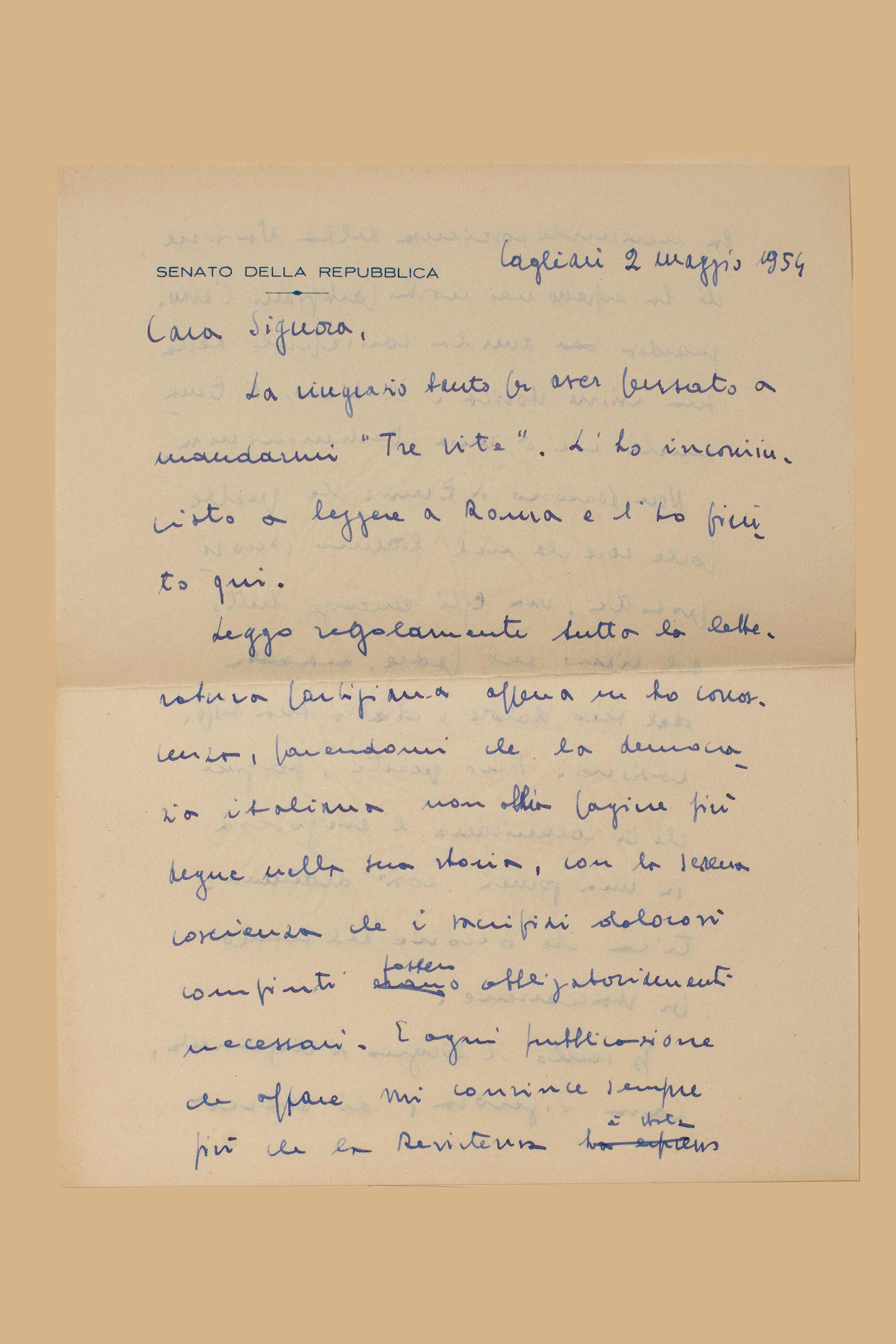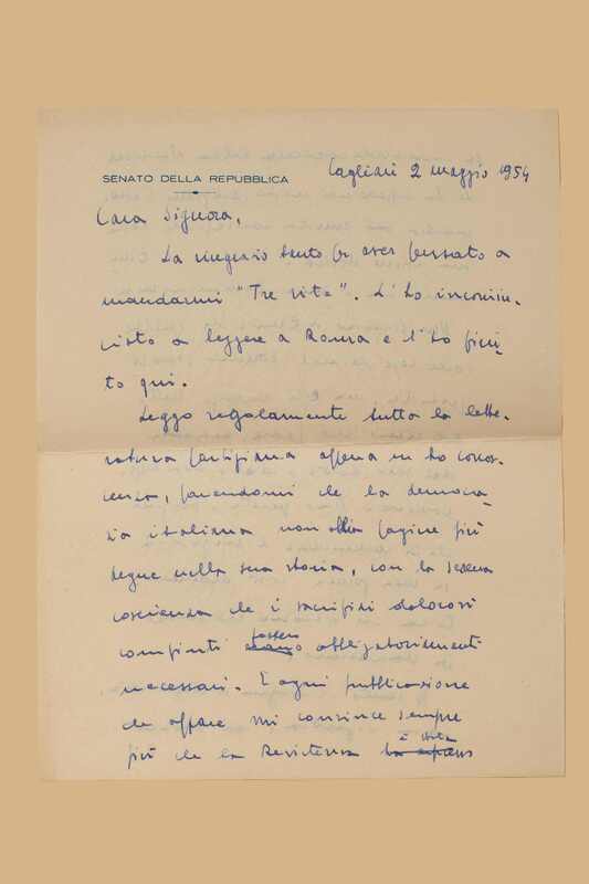 - Biglietto da visita di Amalia Segre Artom che accompagna l'omaggio del volume. Lettera di Lussu per ringraziare dell'omaggio dat. Cagliari, 2 maggio 1954. Cartolina illustrata dat. Agosto 1954 “Vi ricordo con tanto affetto e mille grazie di nuovo, Clara”.