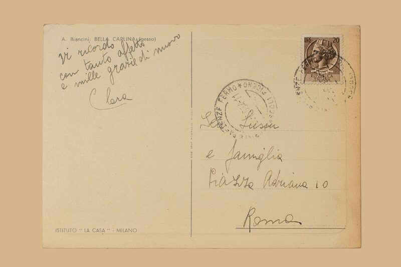 Note: Biglietto da visita di Amalia Segre Artom che accompagna l'omaggio del volume. Lettera di Lussu per ringraziare dell'omaggio dat. Cagliari, 2 maggio 1954. Cartolina illustrata dat. Agosto 1954 “Vi ricordo con tanto affetto e mille grazie di nuovo, Clara”.