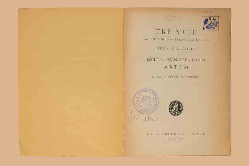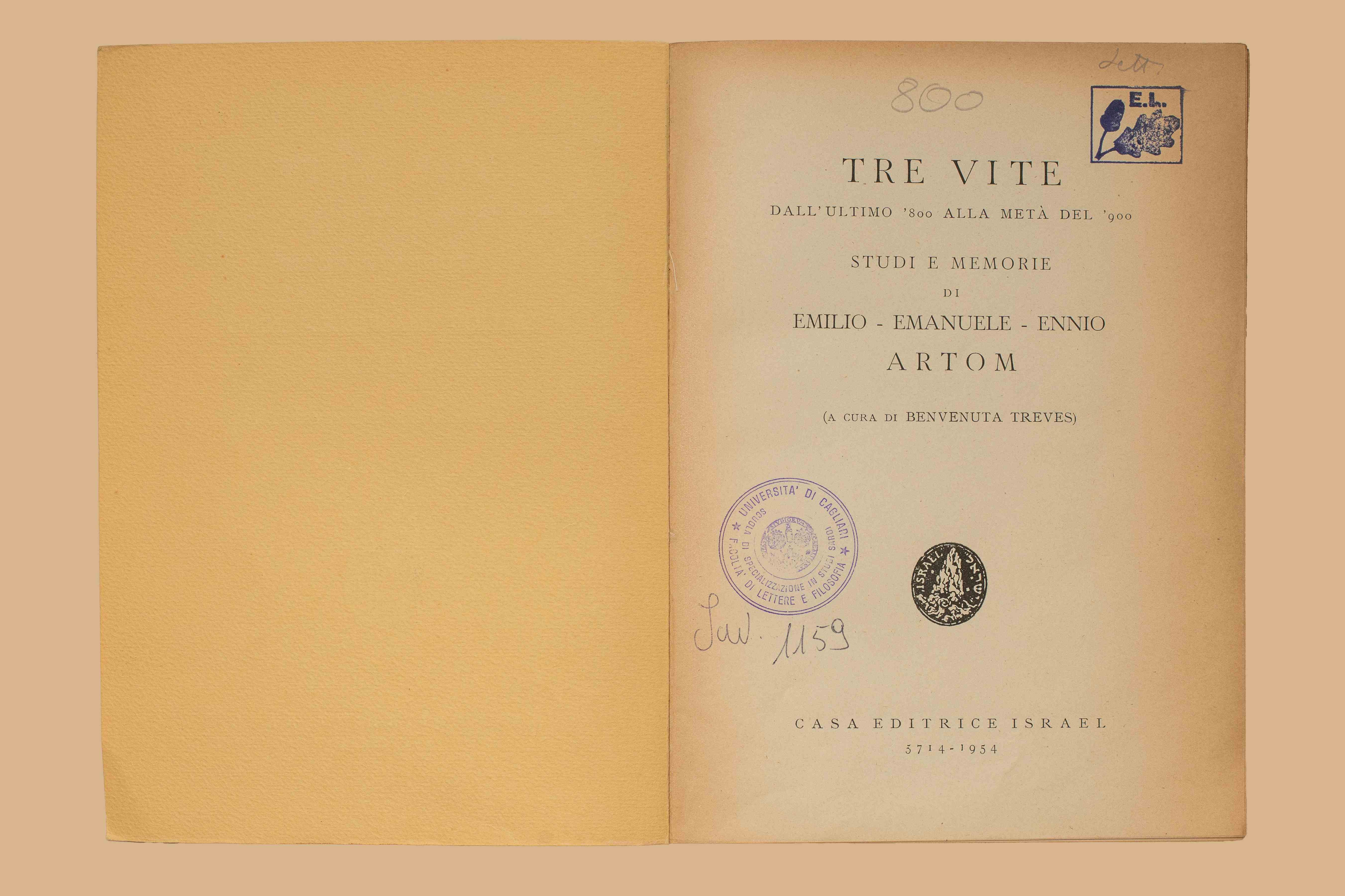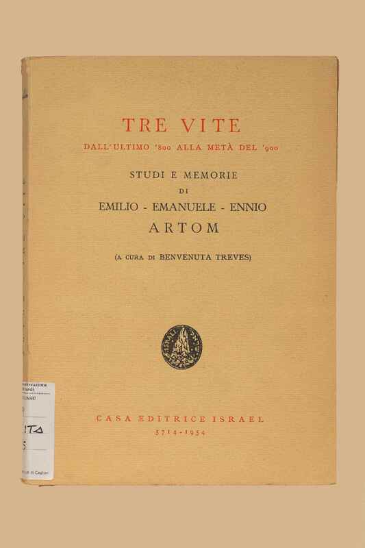 Titolo: Tre vite dall'ultimo '800 alla metà del '900 : studi e memorie di Emilio, Emanuele, Ennio Artom / a cura di Benvenuta Treves. - Firenze : Israel, 1954. - 255 p. ; 22 cm