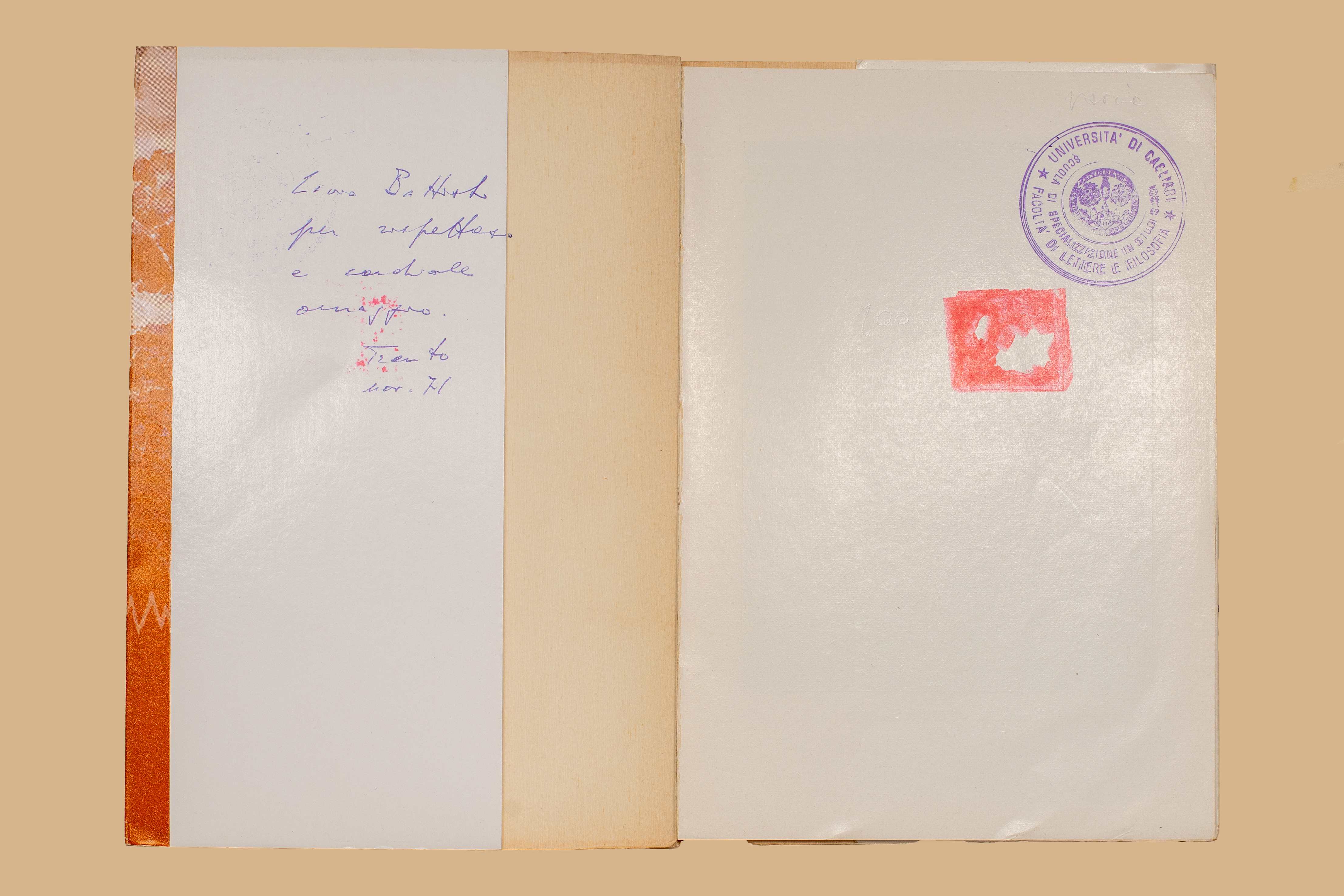 - Nel risvolto della cop. ms. “Livia Battisti per rispettoso e cordiale omaggio. Trento, nov. 71”.