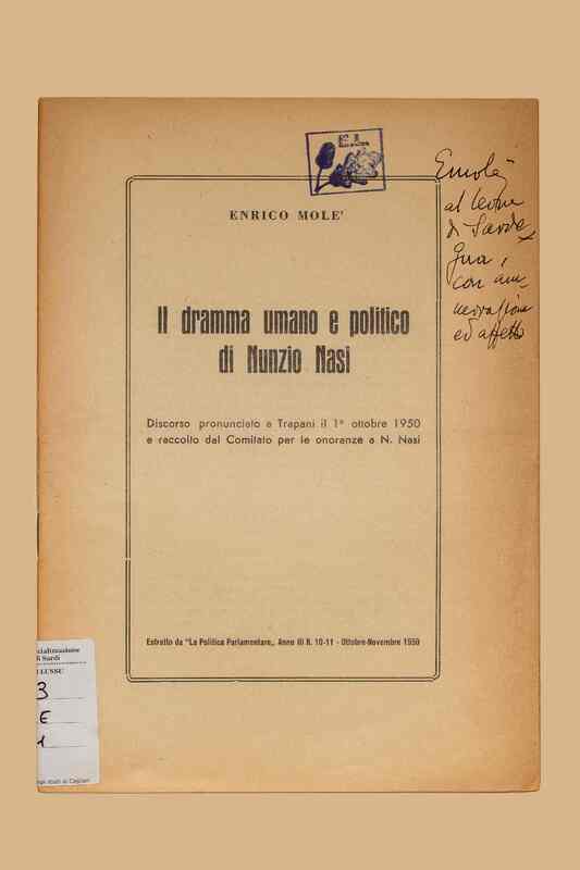 Titolo: Il dramma umano e politico di Nunzio Nasi : discorso pronunciato a Trapani il 1. ottobre 1950 e raccolto dal Comitato per le onoranze a N. Nasi / Enrico Molè. - [S.l. : s.n.], 1950 (Roma : dell'Orso). - 27 p. ; 24 cm. - Già pubbl. in: La politica parlamentare, a. 3., n. 10-11, ottobre-novembre 1950