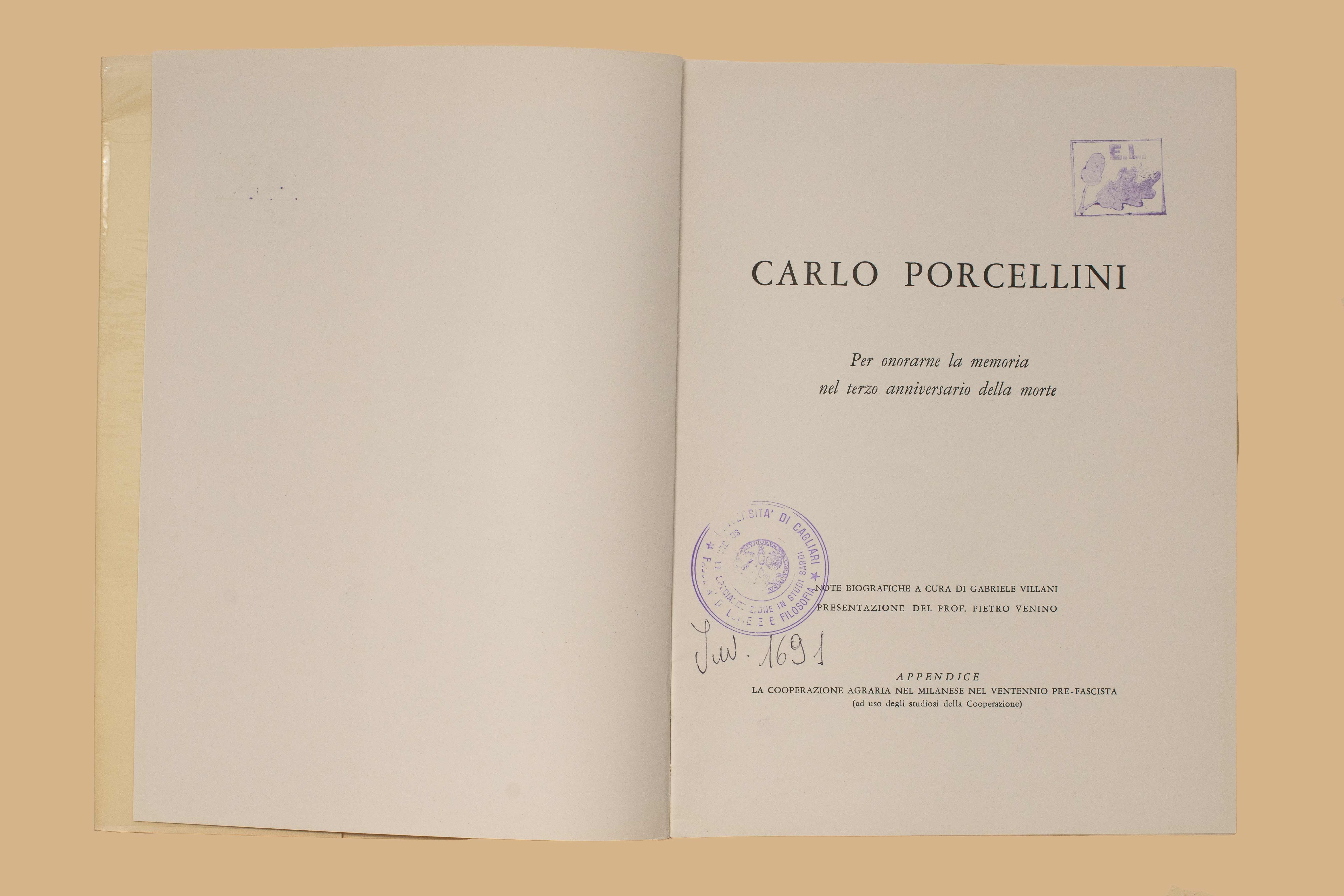 Titolo: Carlo Porcellini : per onorarne la memoria nel terzo anniversario della morte / note biografiche a cura di Gabriele Villani ; presentazione di Pietro Venino ; appendice: La cooperazione agraria nel milanese nel ventennio pre-fascista. - [S.l. : s.n.], 1960 (Milano : Scuole grafiche Pavoniane artigianelli). - 108 p. : ill. ; 21 cm.