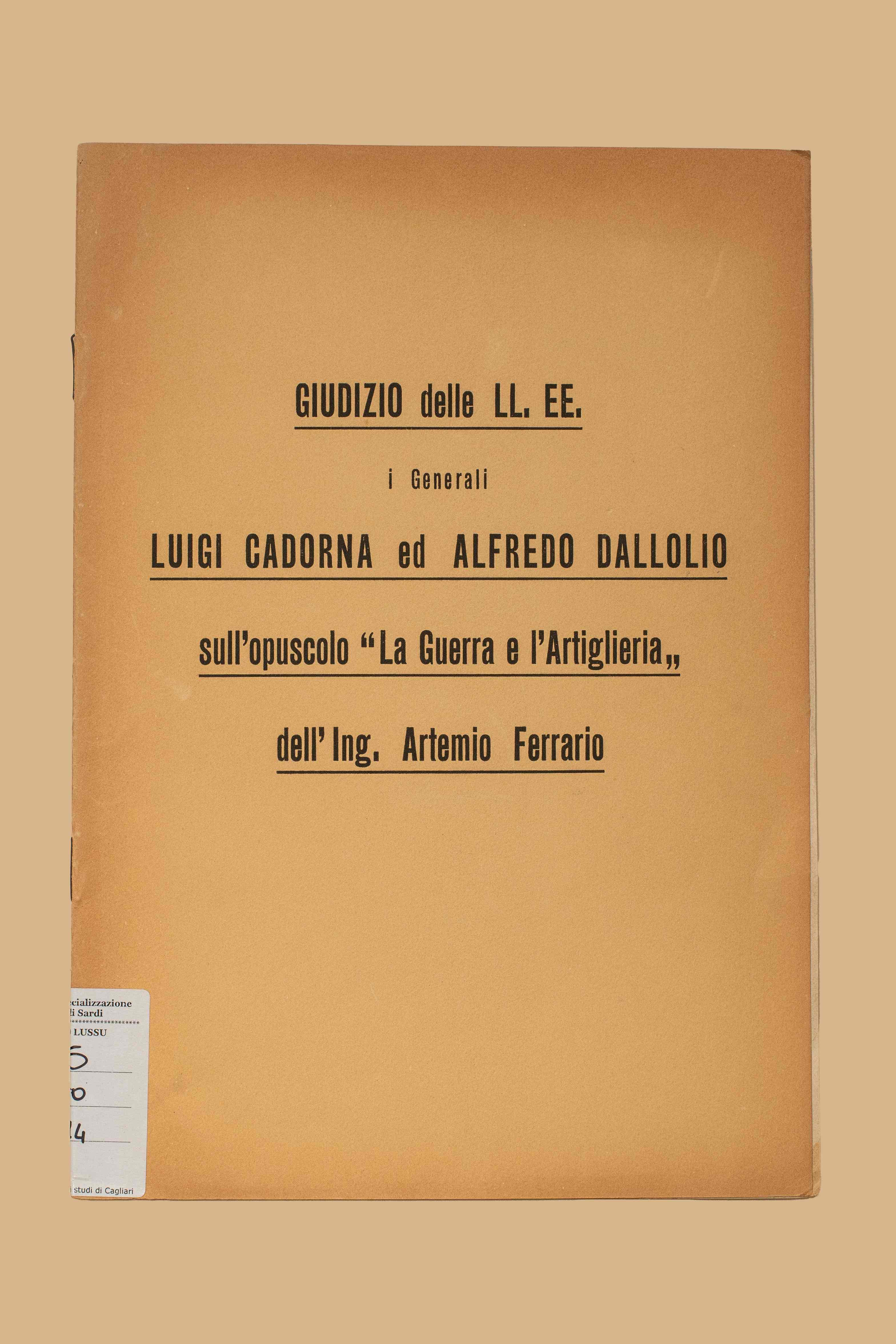 - Giudizio delle LL. EE. i generali Luigi Cadorna ed Alfredo Dallolio sull'opuscolo La guerra e l'artiglieria dell'ing. Artemio Ferrario. - (S.l. : s.n., 1923?). - (8) c. ; 25 cm. - Riproduzione delle lettere scritte dai generali Cadorna e Dallolio all'ing. Ferrario.