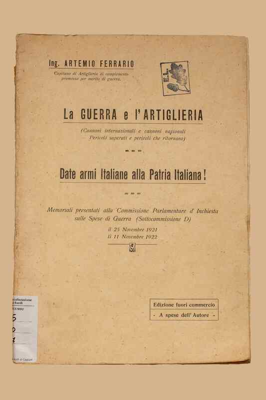 Titolo: La guerra e l'artiglieria ; Date armi italiane alla patria italiana : memoriali presentati alla Commissione parlamentare d'inchiesta sulle spese di guerra, sottocommissione D, il 25 novembre 1921, il 11 novembre 1922 / Artemio Ferrario. - [S.l.] : a spese dell'autore, [192.]. - 83 p., 14 c. di tav. : ill. ; 25 cm. - Ed. fuori commercio.