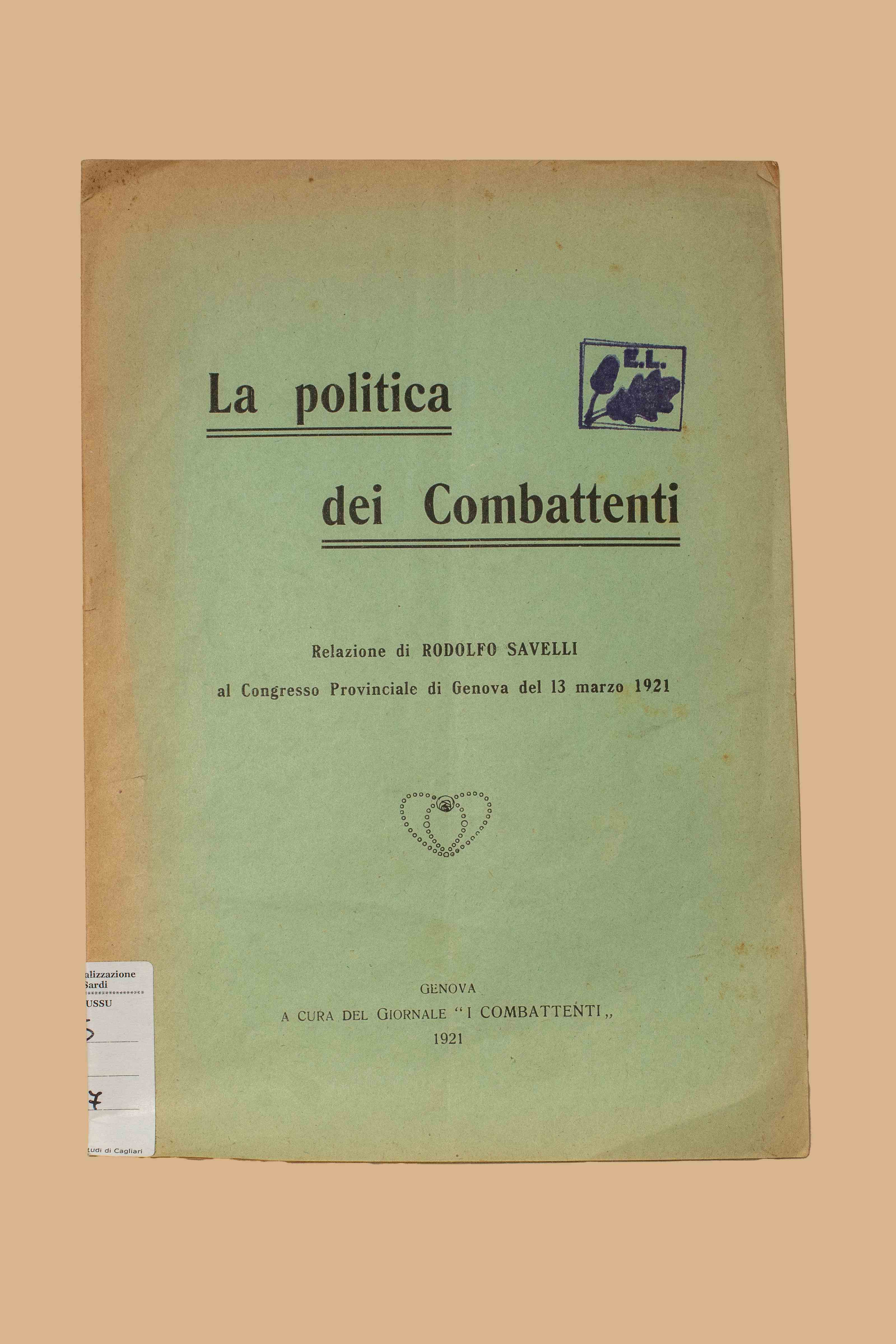 Titolo: La politica dei combattenti / relazione di Rodolfo Savelli. - Genova : a cura del giornale "I Combattenti", 1921. - 8 p. ; 24 cm. - Relazione approvata al Congresso Provinciale di Genova del 13 marzo 1921.