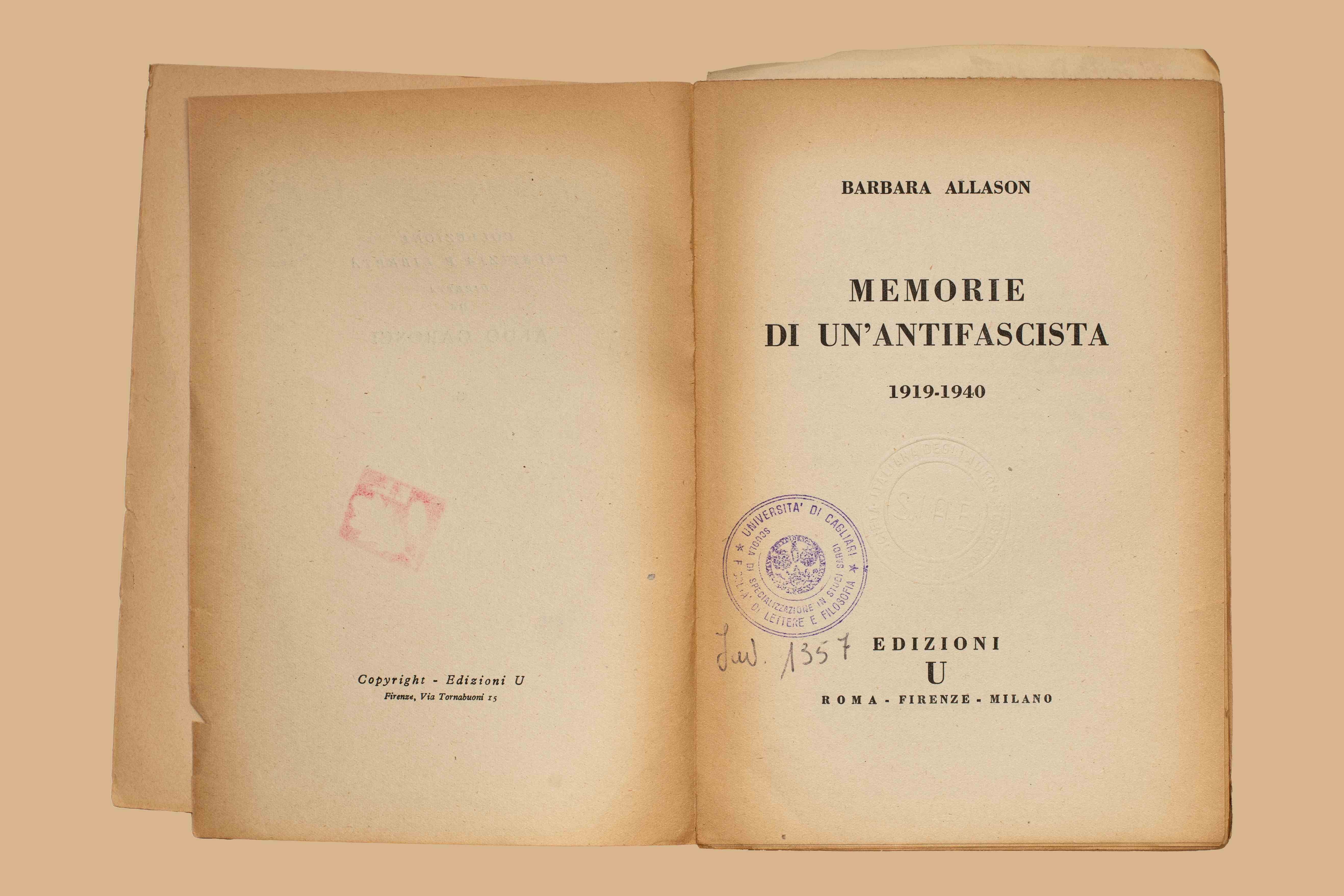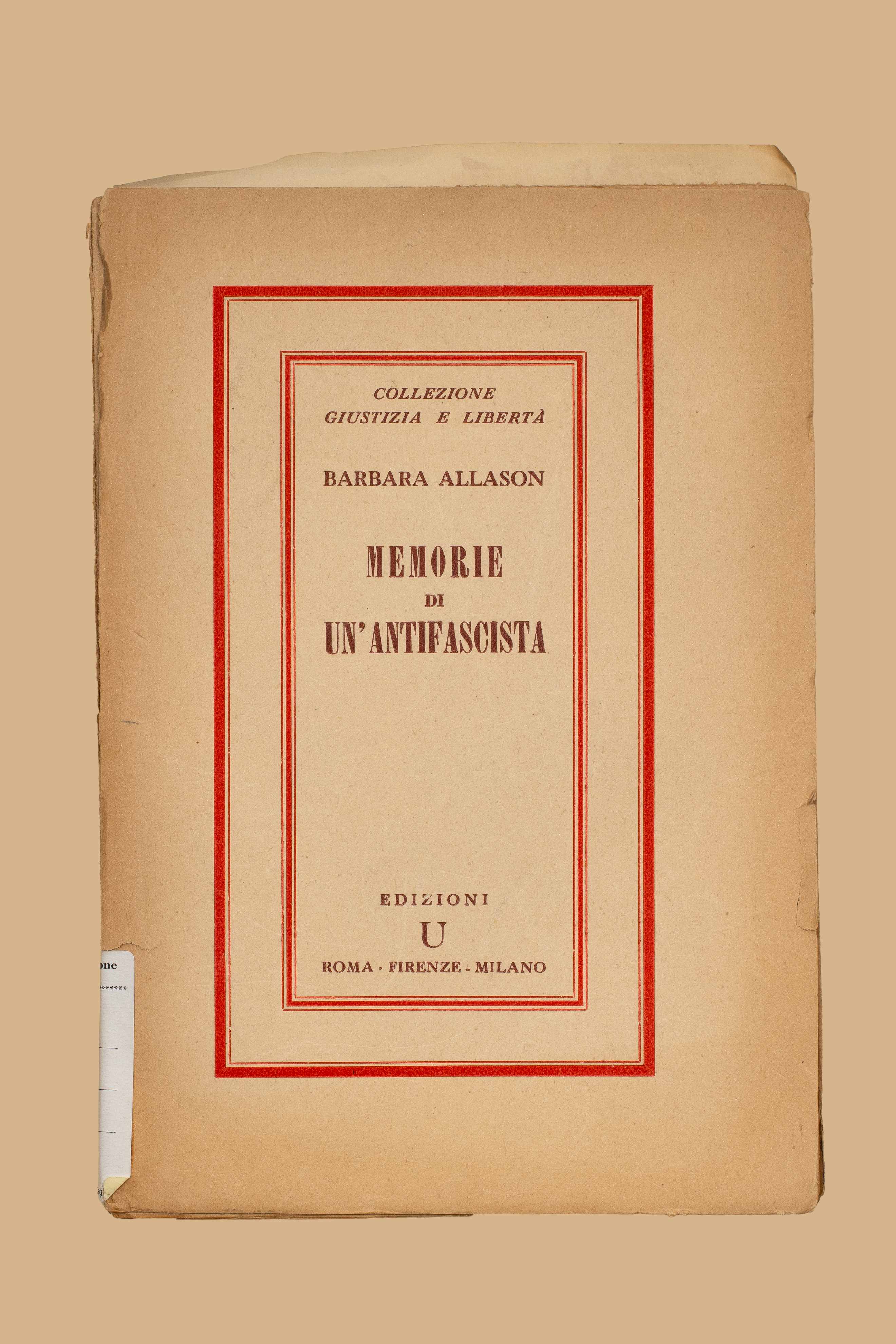 Titolo: Memorie di un'antifascista : 1919-1940 / Barbara Allason. - Roma ; Firenze ; Milano : Edizioni U, [1945?]. - 303 p. ; 20 cm. - (Collezione giustizia e liberta ; 6)