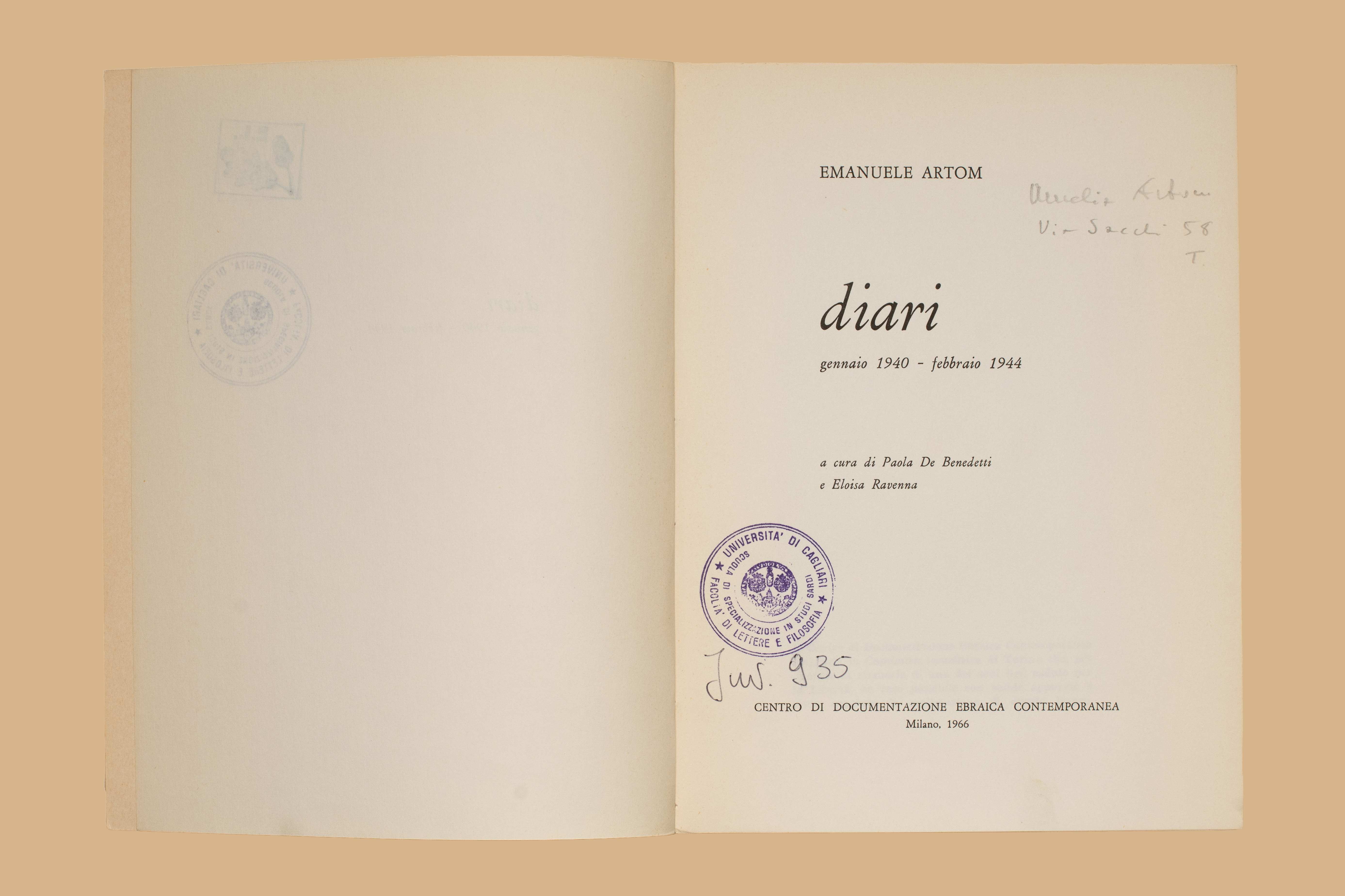 - Diari : gennaio 1940-febbraio 1944 / Emanuele Artom ; a cura di Paola De Benedetti e Eloisa Ravenna. - Milano : Centro di documentazione ebraica contemporanea, 1966. - 182 p., [6] c. di tav. : ill. ; 21 cm.