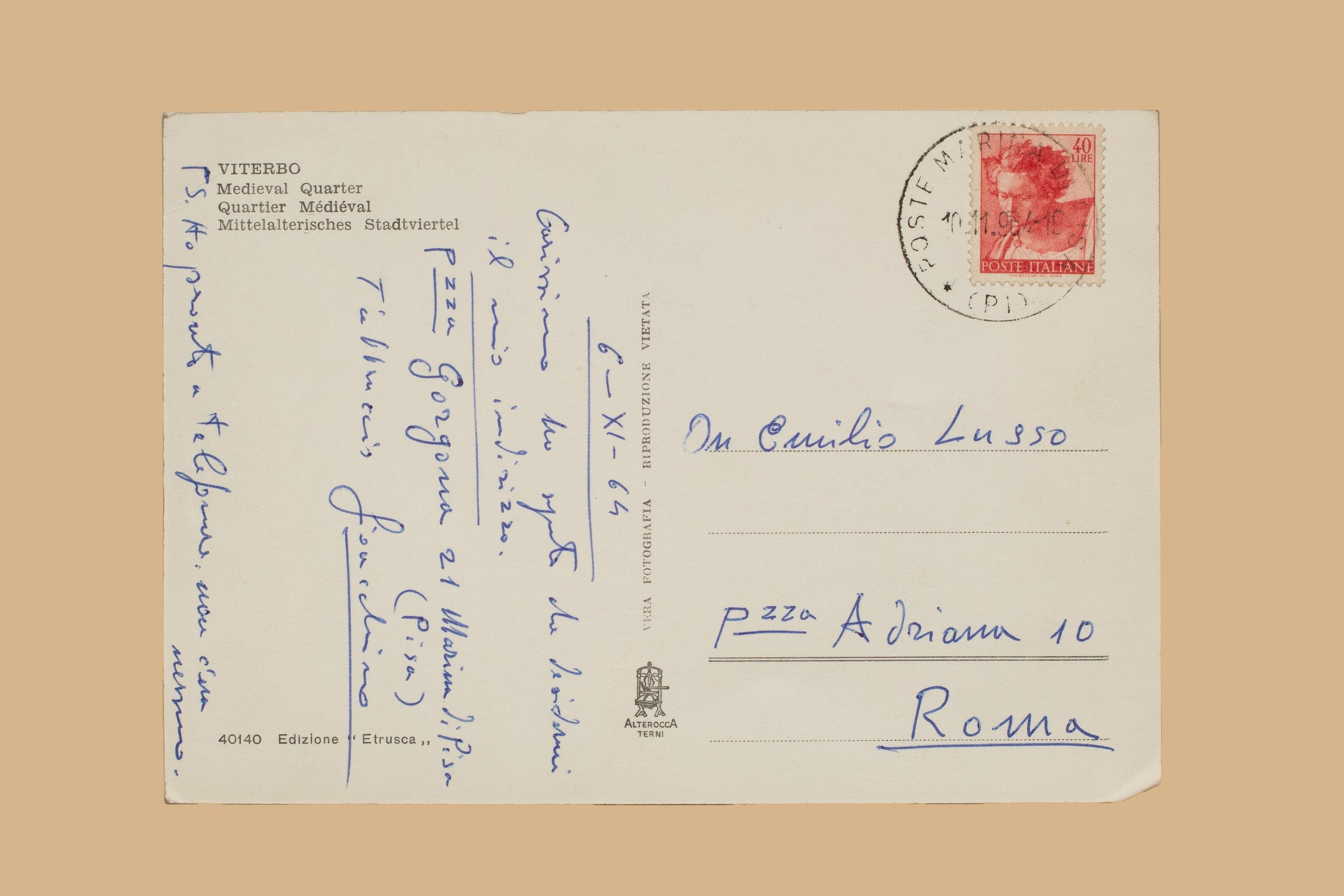 Note: Cartolina dat. 6.11.64 da Viterbo in cui Gioacchino [Dolci?] comunica l'indirizzo di Marina di Pisa.