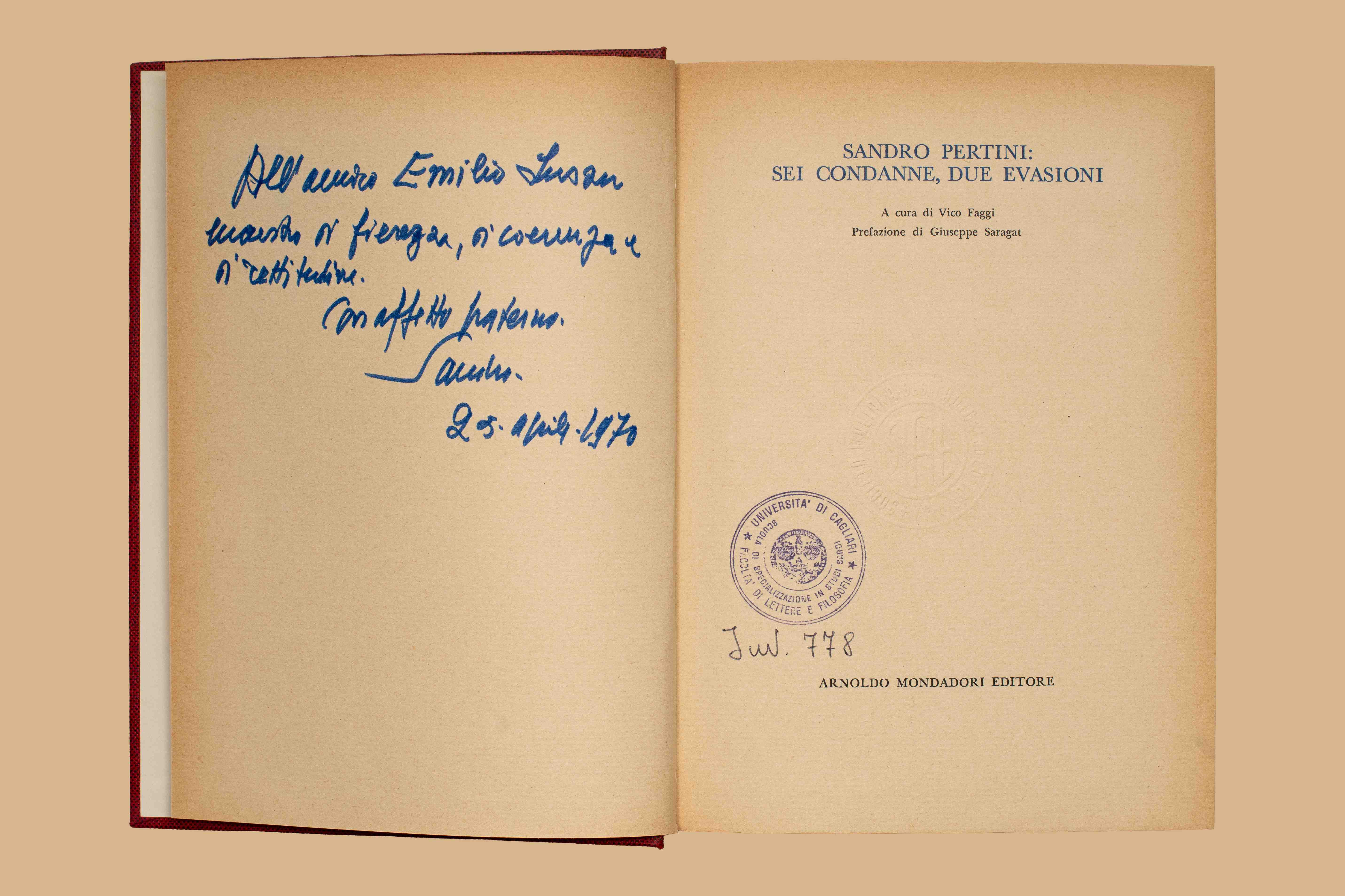 Note: Prima del front. dedica ms. “All’amico Emilio Lussu, maestro di fierezza, di coerenza e di rettitudine. Con affetto fraterno, Sandro, 25 aprile, 1970”.