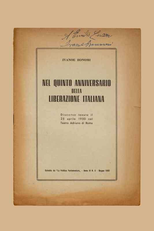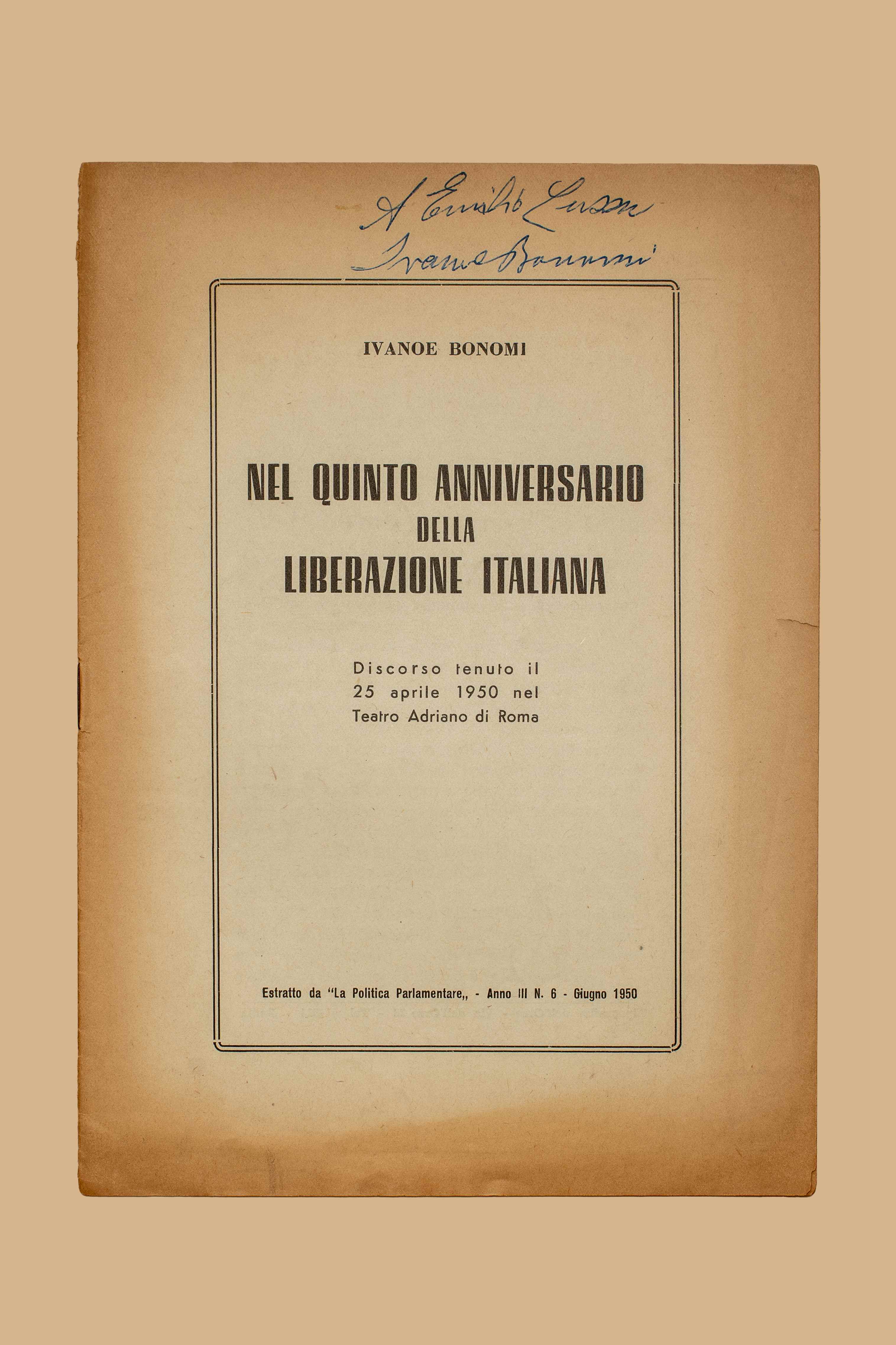 Titolo: Nel quinto anniversario della liberazione italiana : discorso tenuto il 25 aprile 1950 nel Teatro Adriano di Roma / Ivanoe Bonomi. – [S. l. : s. n.], 1950 (Roma : Tip. Dell’orso). – 14 p. ; 24 cm. – Estr. da: “La politica parlamentare”, 3 (1959), n. 6 (giugno).