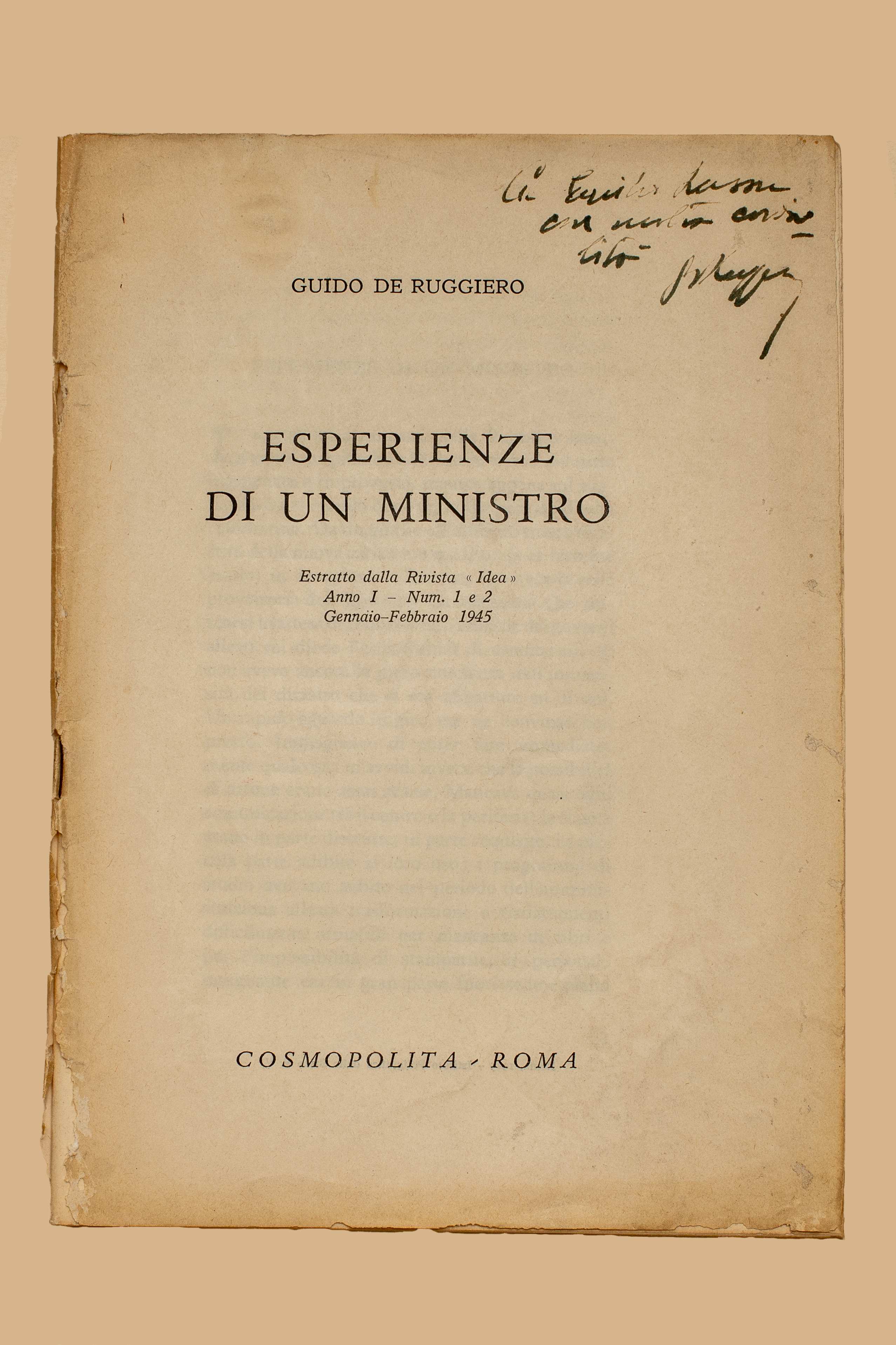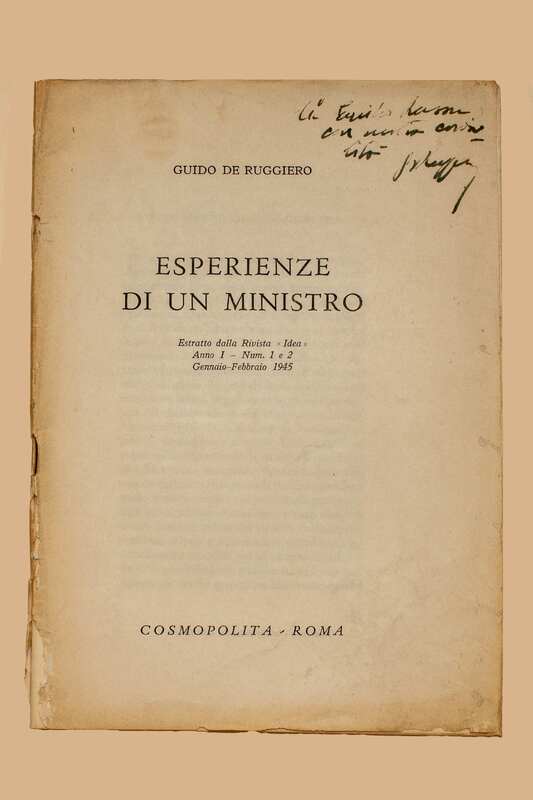 Titolo: Esperienze di un ministro / Guido De Ruggiero. – Roma : Cosmopolita, 1945. – 49 p. ; 21 cm. – Estr. da: “Idea”, 1 (1945), n. 1-2.