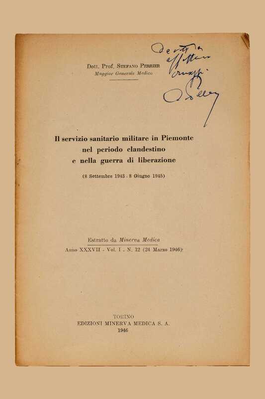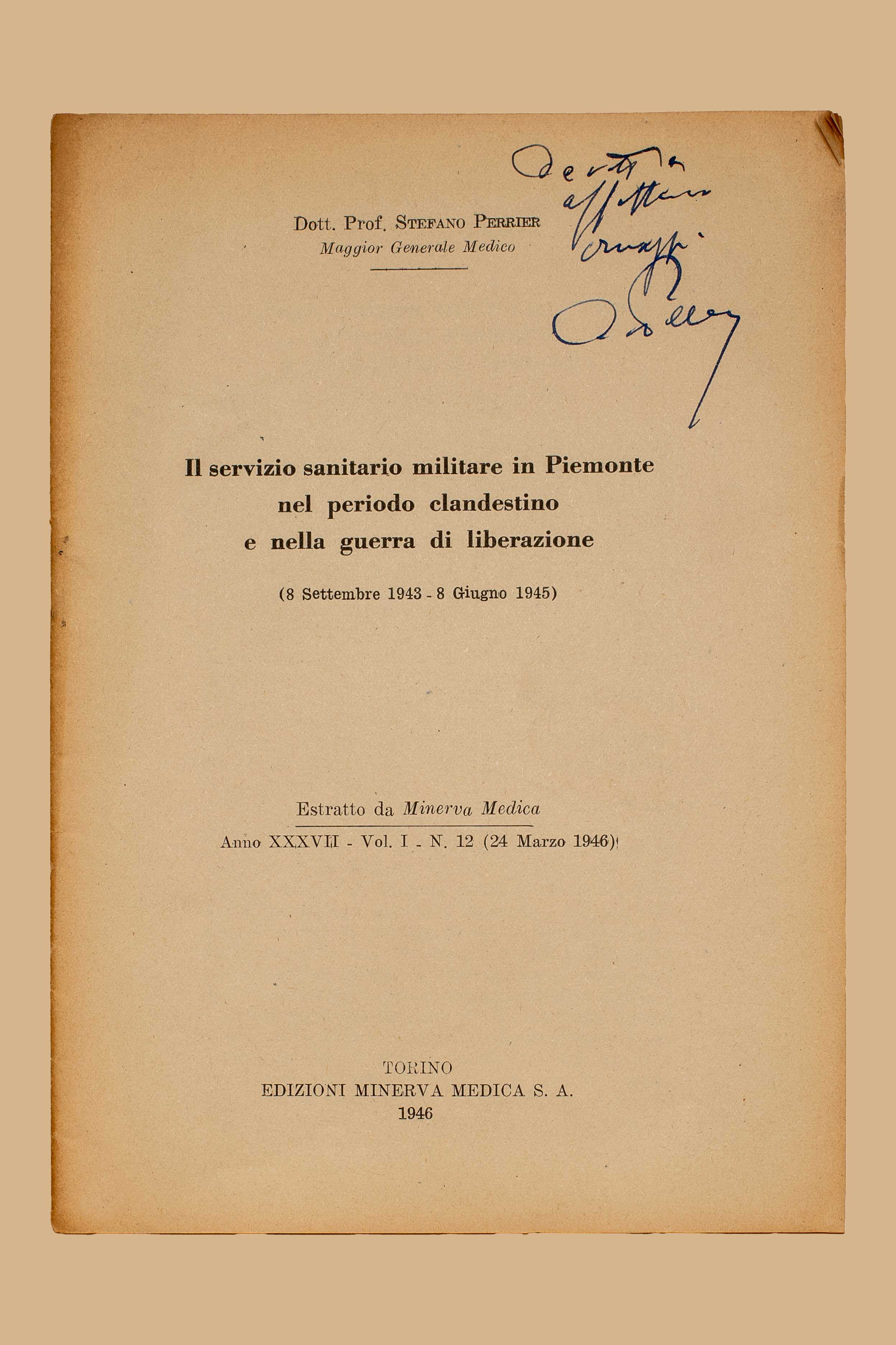 Titolo: Il servizio sanitario militare in Piemonte nel periodo clandestino e nella guerra di liberazione : (8 settembre 1943-8 giugno 1945) / Stefano Perrier. – Torino : Minerva medica, 1946. – 23 p. ; 21 cm. – Estr. da: “Minerva medica”, 37(1946), vol. 1, n. 12.