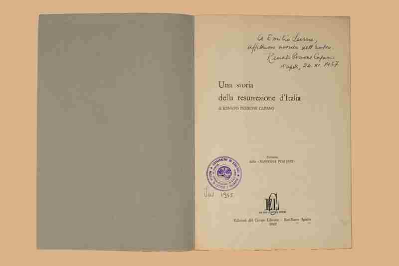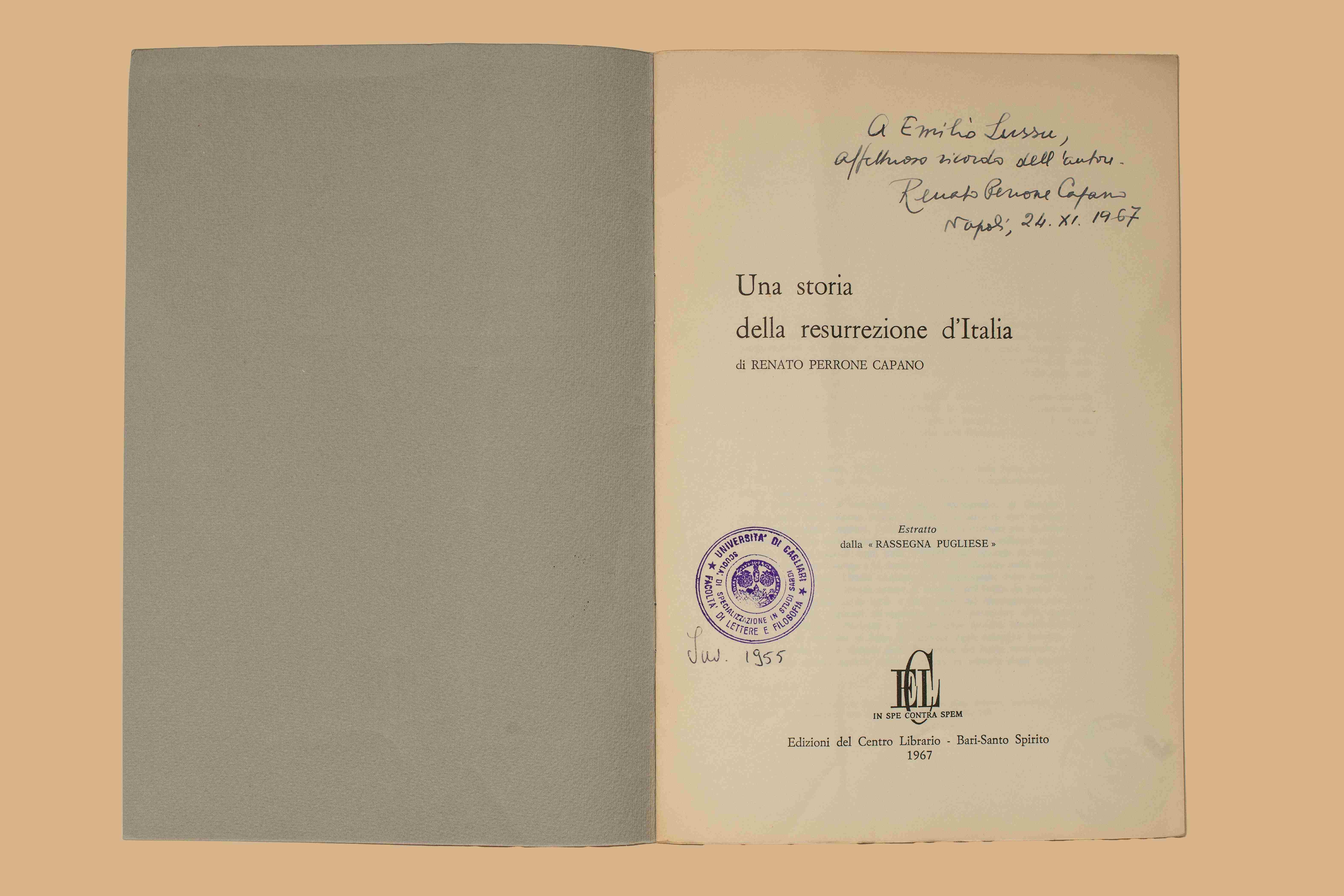 - Nel front. dedica ms. dell'a.: “A Emilio Lussu, affettuoso ricordo dell'autore. Renato Perrone Capano, Napoli, 24.XI.1967”.