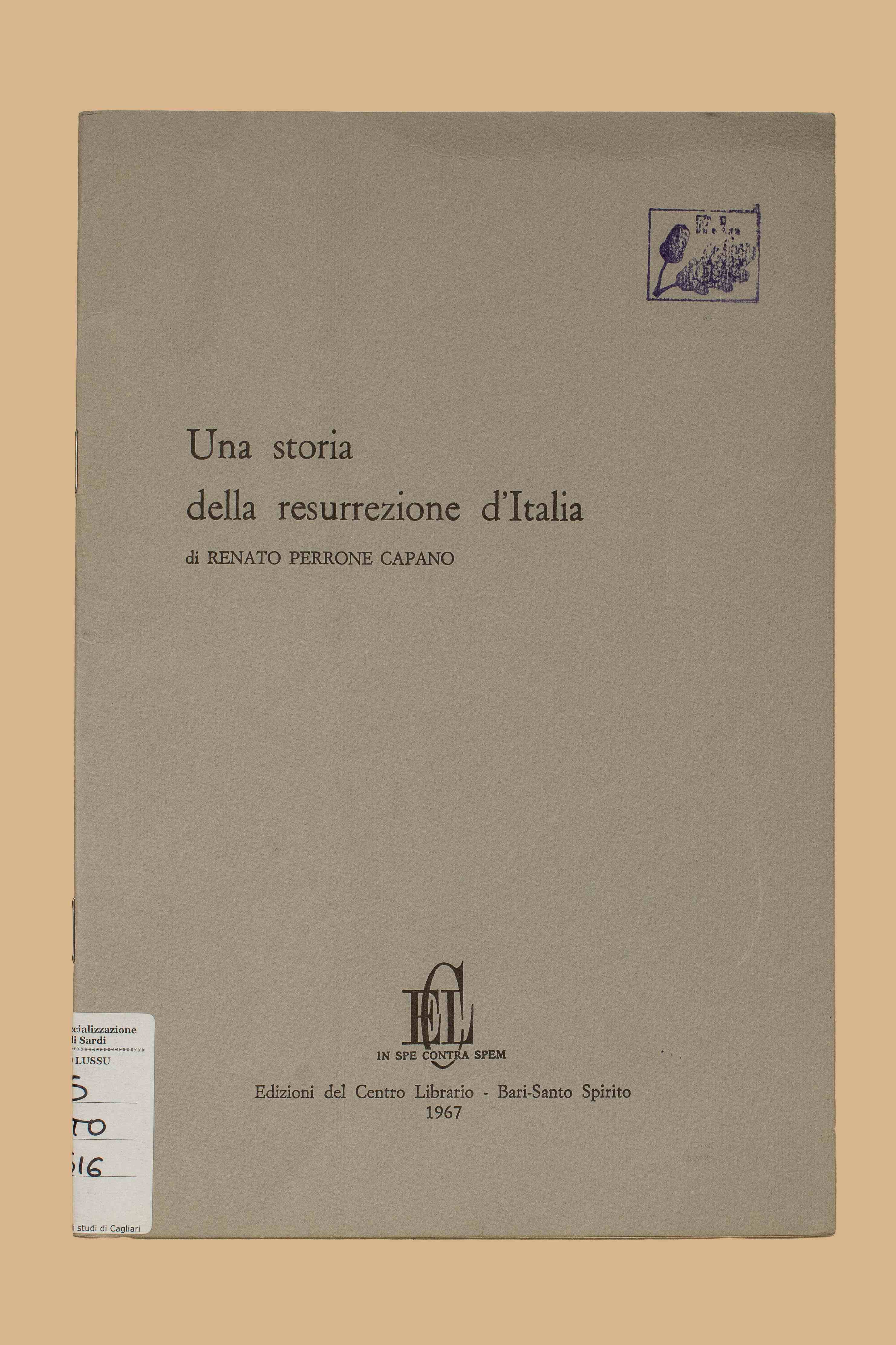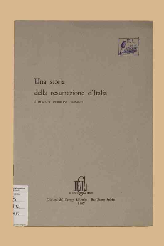 Titolo: Una storia della resurrezione d'Italia / di Renato Perrone Capano. - Santo Spirito (Bari) : Edizioni del Centro Librario, 1967. - 15 p. ; 25 cm. - Estr. da: Rassegna pugliese, a. 2, n. 4 (1967).
