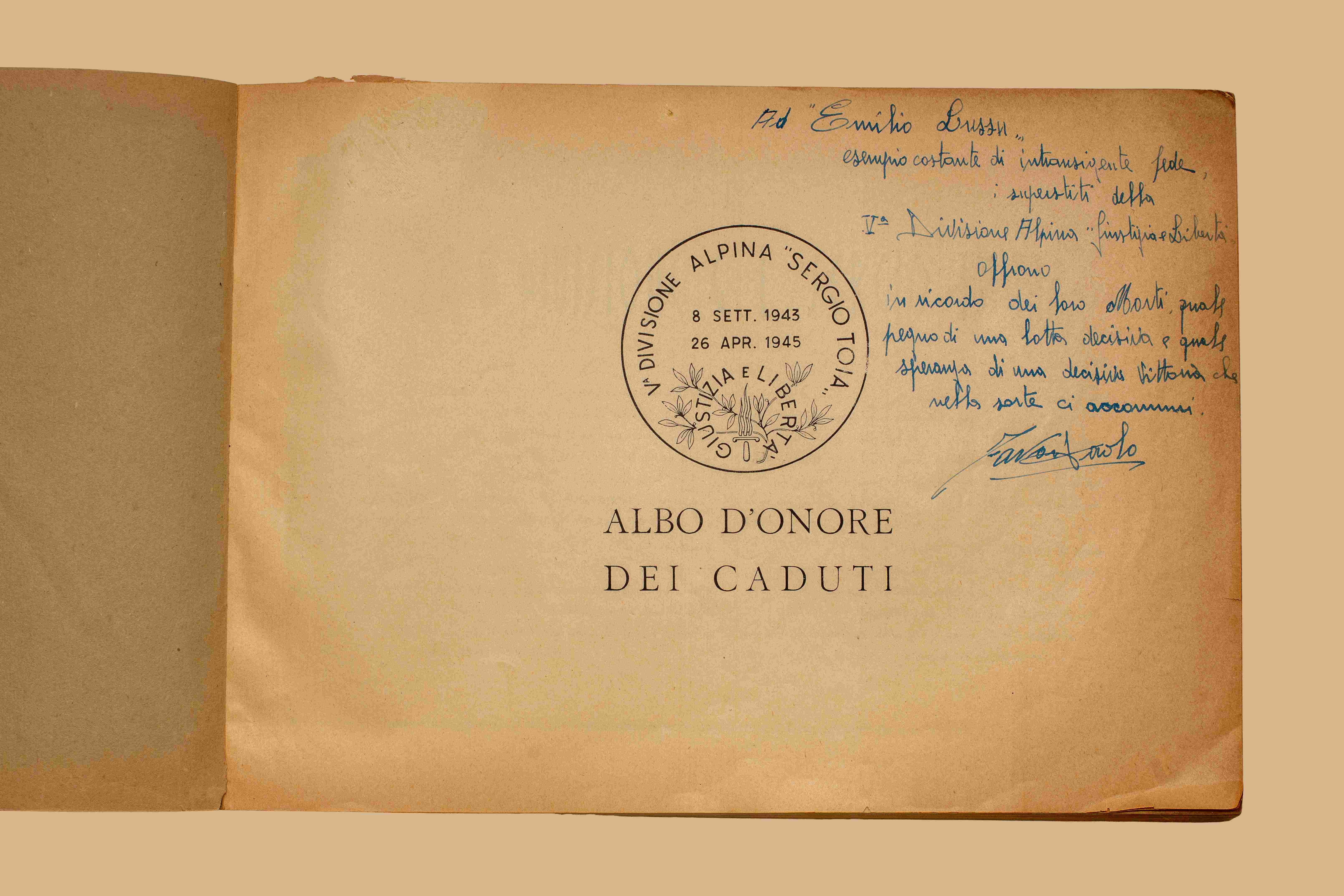 Sul front. dedica ms. “Ad Emilio Lussu, esempio costante di intransigente fede offrono i superstiti della V divisione alpina Giustizia e Libertà …”.