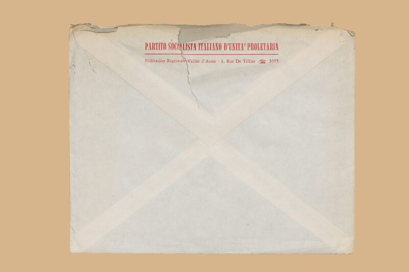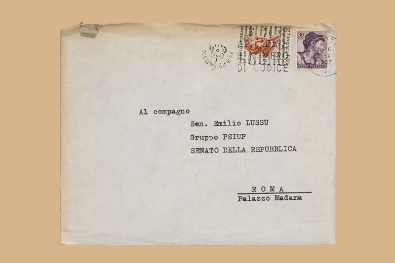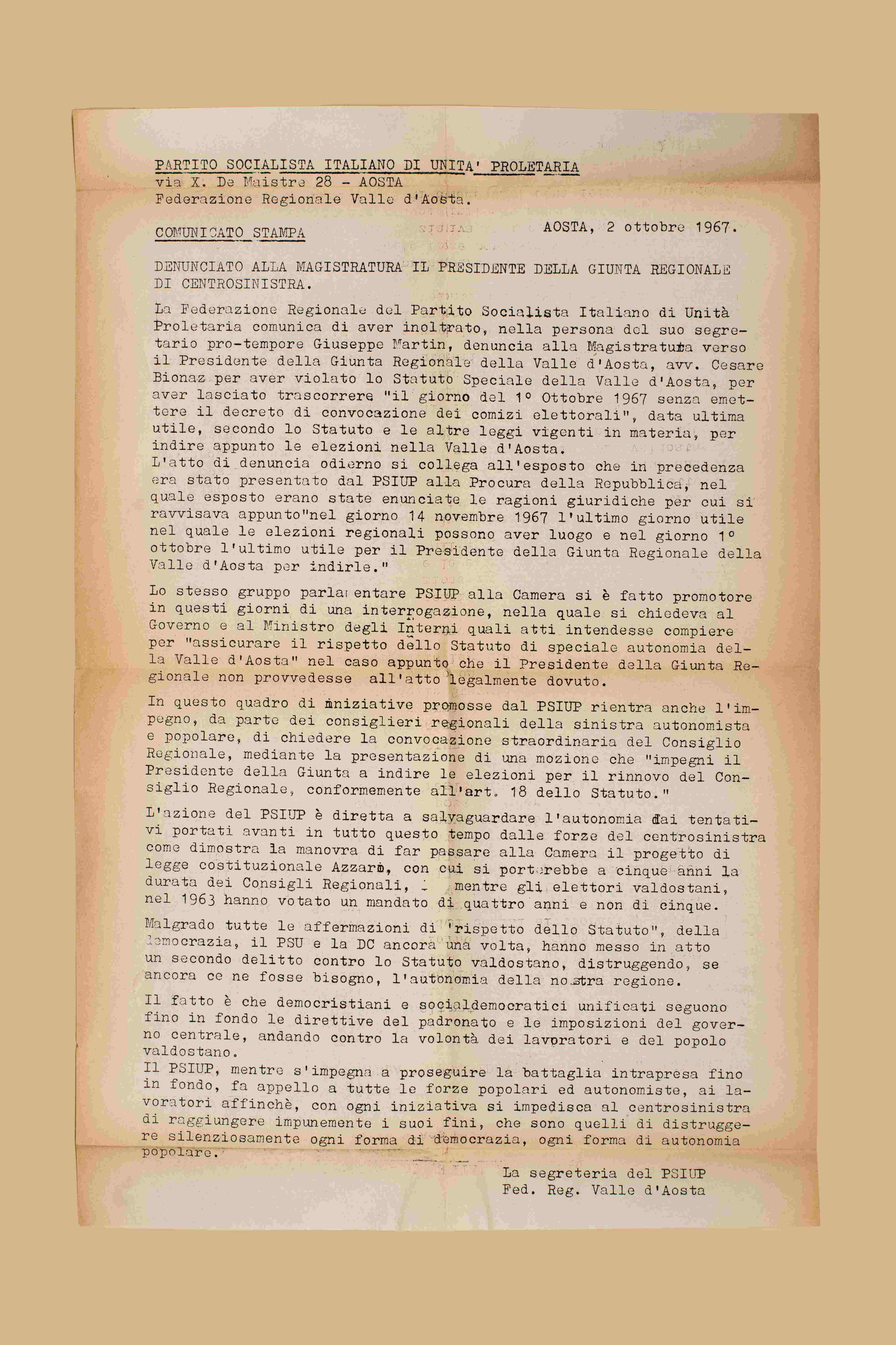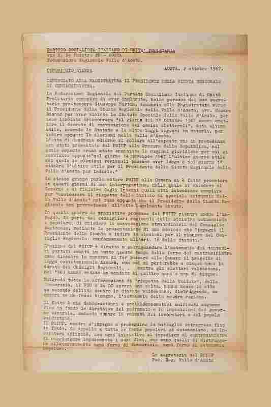 - Busta da lettera indirizzata “Al compagno Sen. Emilio Lussu, Gruppo PSIUP, Senato della Repubblica” con affrancatura del 1967; dentro la busta comunicato stampa del PSIUP, Federazione della Valle d'Aosta, datato Aosta 2 ottobre 1967 che rende nota la denuncia del Presidente della giunta regionale di centro sinistra effettuata dalla Federazione regionale del PSIUP per avere violato lo statuto speciale in merito alla convocazione dei comitati elettorali. Appunti ms. e ds. con “Emendamenti aggiuntivi al DDL 2350.