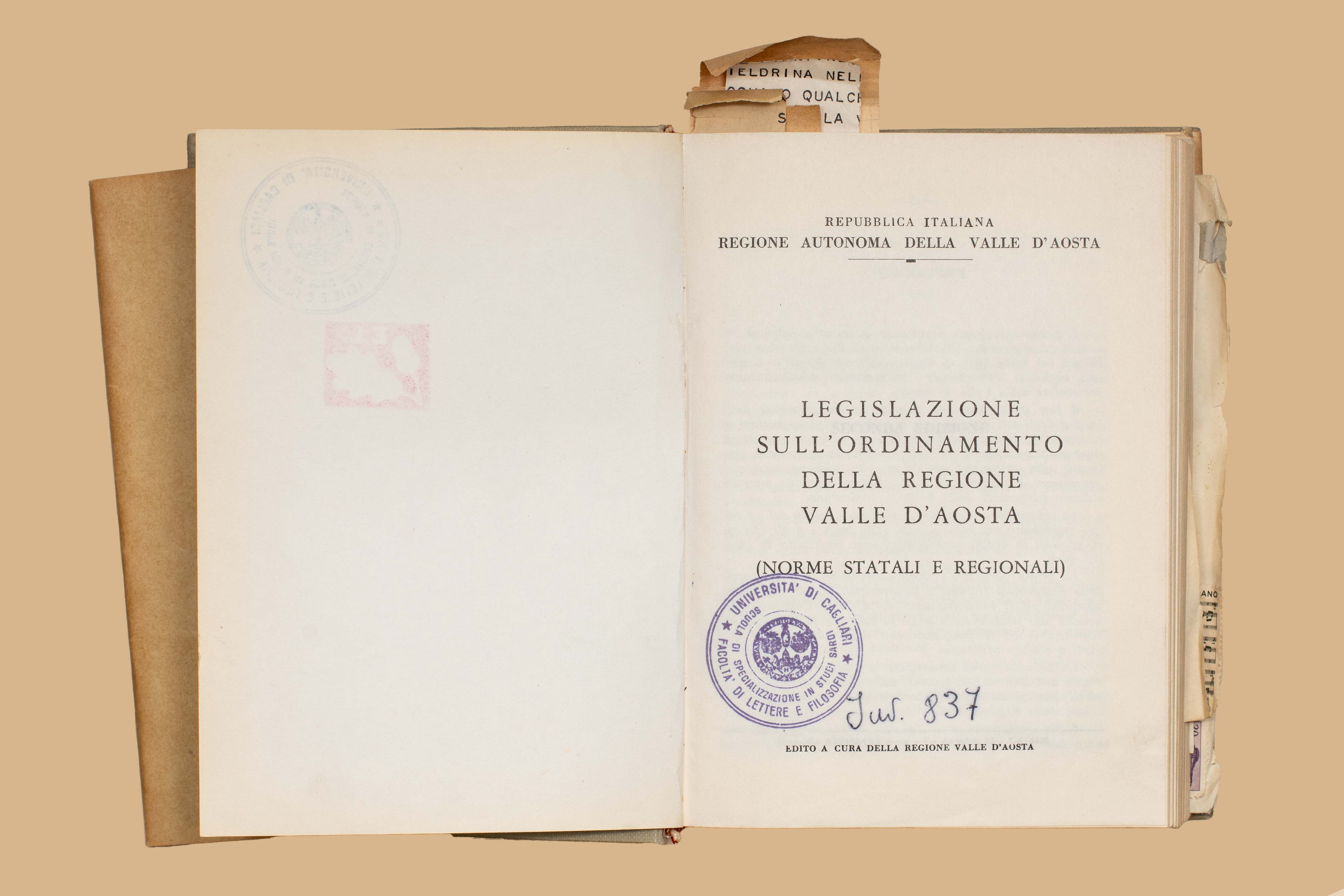 - Legislazione sull'ordinamento della regione Valle d' Aosta : (norme statali e regionali) / edito a cura della regione Valle d' Aosta. - 2. ed. - Aosta : Tip. artigiana, pref. 1963. - VIII, 914 p. ; 17 cm. - In testa al front.: Regione autonoma della Valle d'Aosta