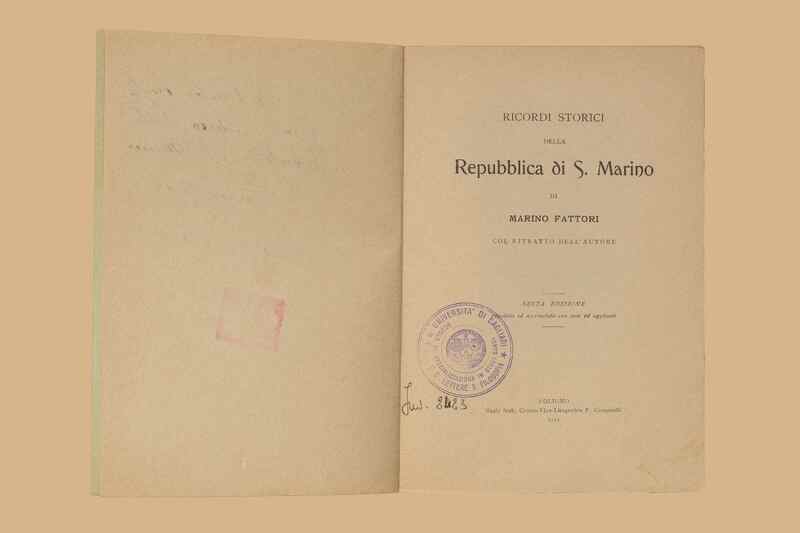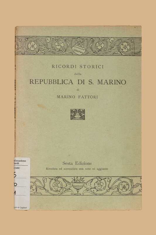Titolo: Ricordi storici della Repubblica di S. Marino / di Marino Fattori. - 6. ed., riveduta ed accresciuta, con note ed aggiunte. - Foligno : Tip. F. Campitelli, 1912. - 141 p., [1] c. di tav. : ritr. ; 18 cm.
