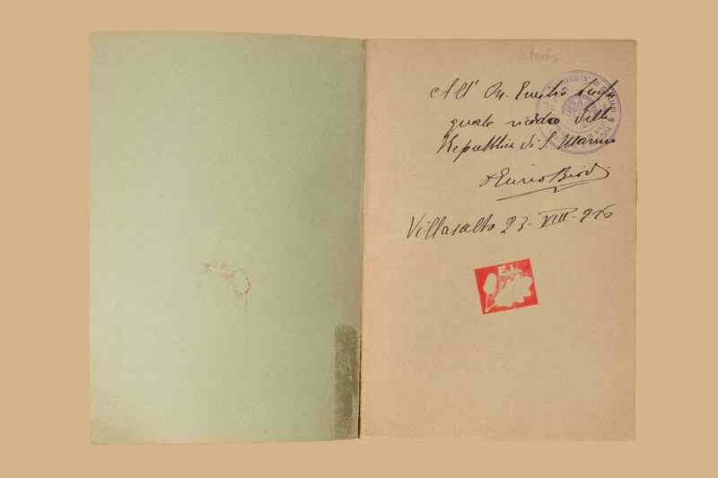 Note: Nell'occhietto dedica ms. “All'on. Emilio Lussu, quale ricordo della repubblica di S. Marino, D. Enrico Biordi Villasalto, 23.VIII.926”. Cartolina da San Marino, dat. 8.X.926, “Distintissimi saluti, D. E. Biordi".